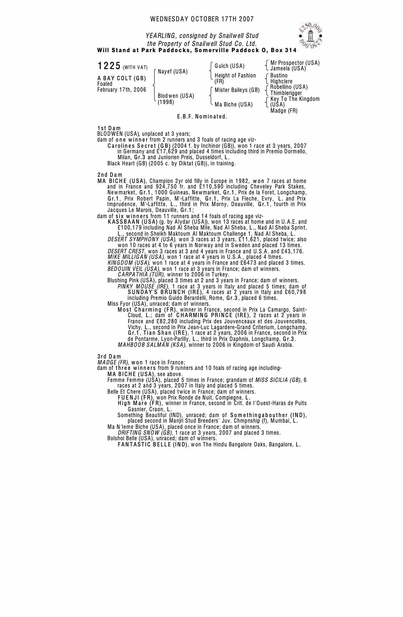 December Foal Sale 2006 lot 1301, Snailwell Stud=>Vendor 16,000 gns