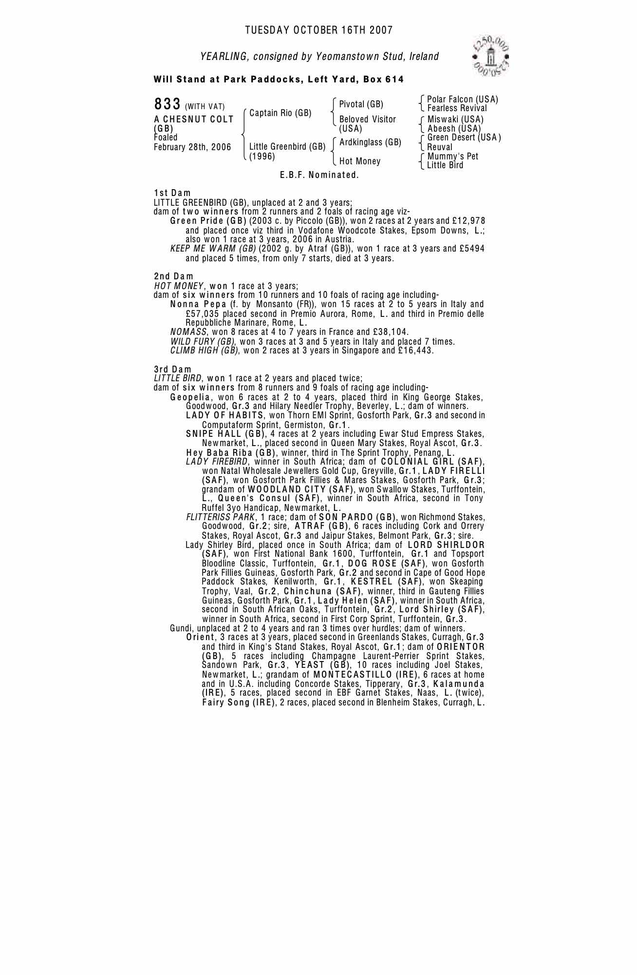 Consignor: Yeomanstown Stud, Ireland