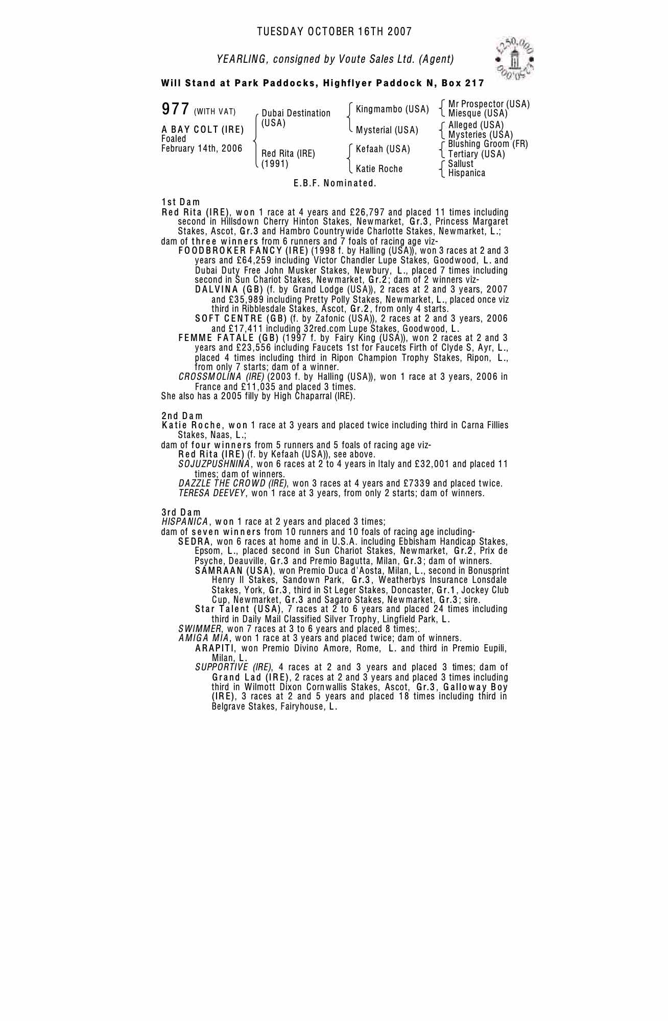 October Yearling Sale, Book 1 2006 lot 427 F. by High Chaparral (IRE) 2005, Voute Sales Ltd. (Agent)=>Lot Not Sold 30,000 gns