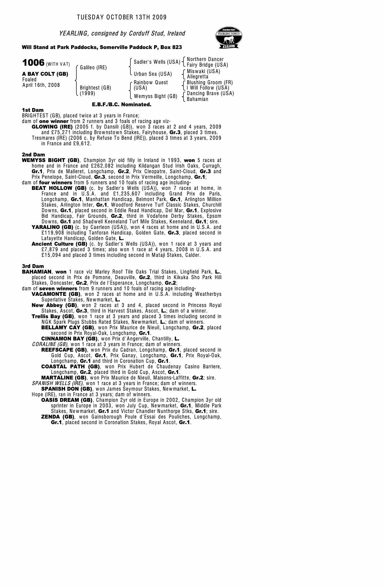 October Yearling Sale, Book 2 2006 lot 988 F. by Dansili (GB) 2005, Corduff Stud, Ireland (Agent)=>Margaret O'Toole 160,000 gns