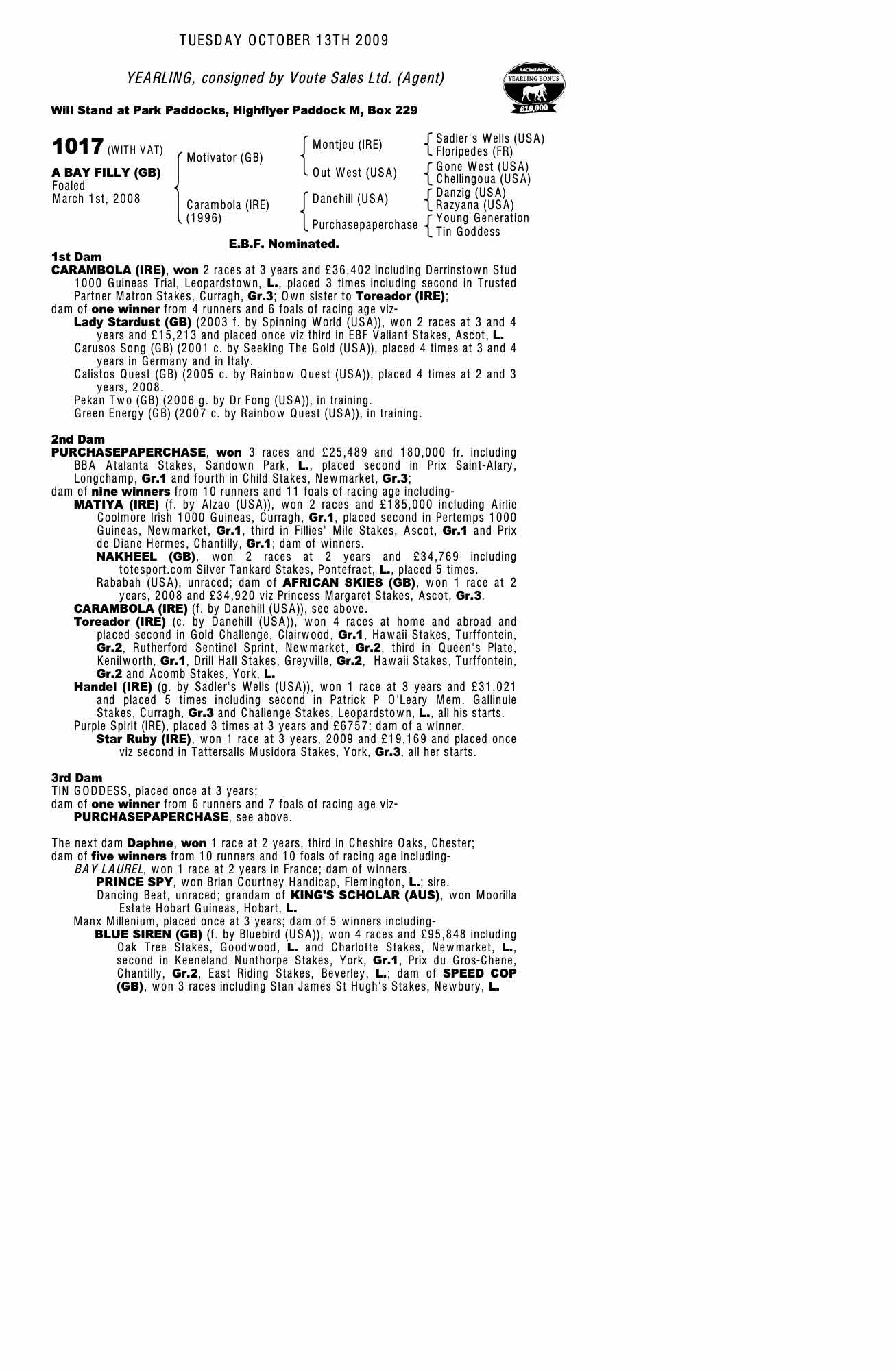 October Yearling Sale, Book 1 2004 lot 426 F. by Spinning World (USA) 2003, Voute Sales, Agent=>Anthony Stroud Bloodstock 55,000 gns