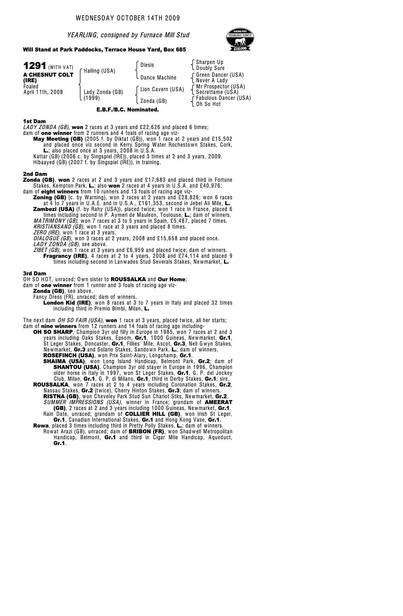 October Yearling Sale, Book 1 2007 lot 110 C. by Singspiel (IRE) 2006, Hillwood Stud=>Edward F Vaughan 70,000 gns