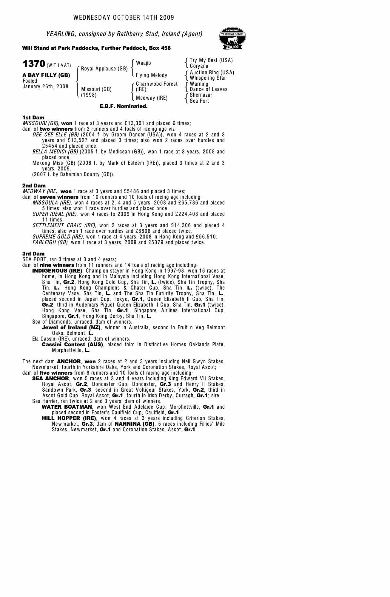 July Sale 2008 lot 863 Bella Medici (GB) (F. by Medicean (GB)), Flint Cottage Stables=>MH Tompkins 2,700 gns