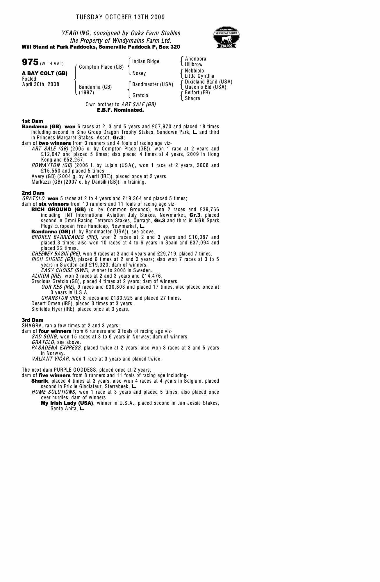 October Yearling Sale, Book 1 2008 lot 387 C. by Dansili (GB) 2007, Meadowlands Stud, Ireland=>Shadwell Estate Company 300,000 gns