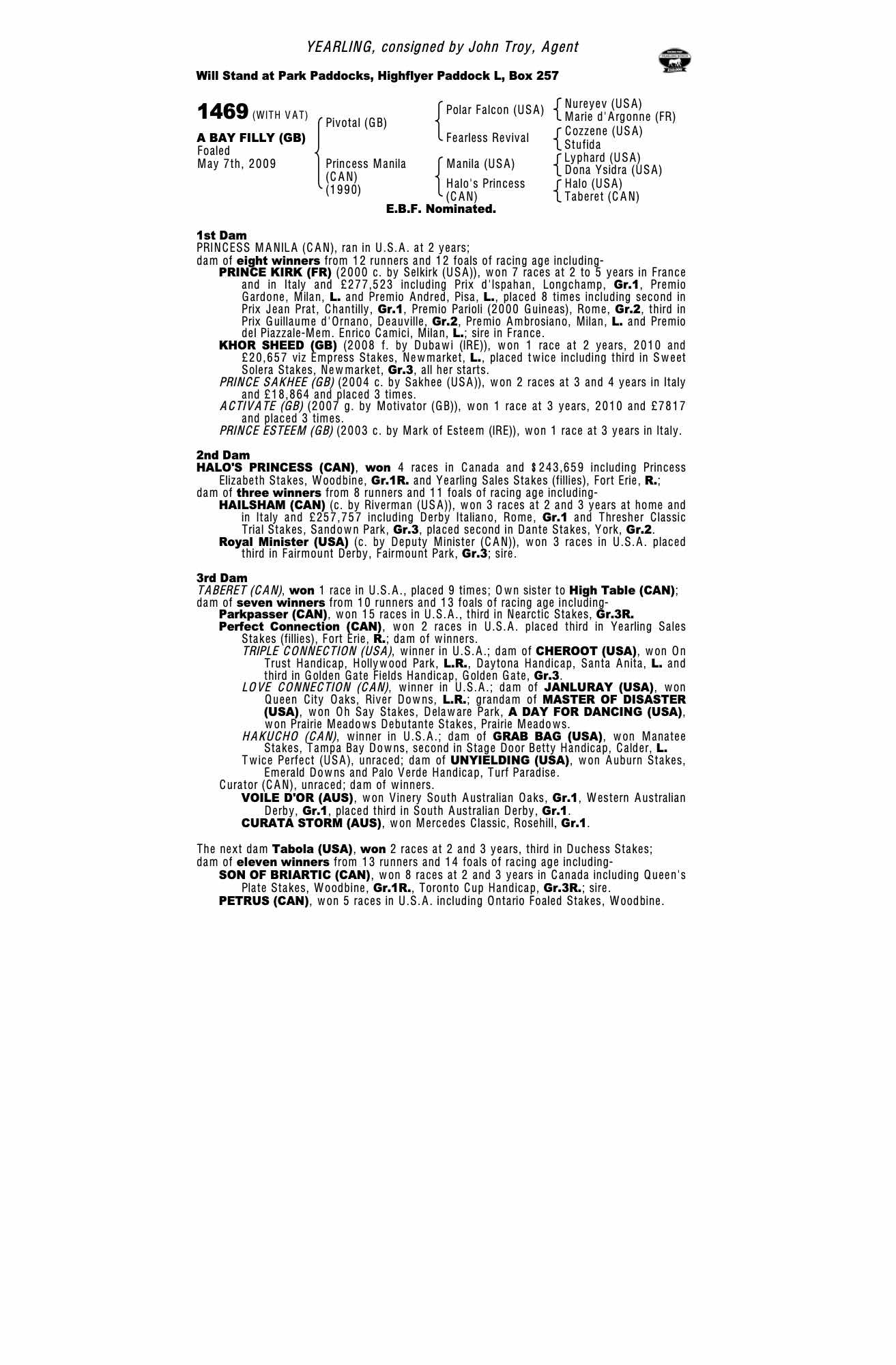 October Yearling Sale, Book 1 2009 lot 674 F. by Dubawi (IRE) 2008, John Troy, Agent=>LM Cumani 42,000 gns