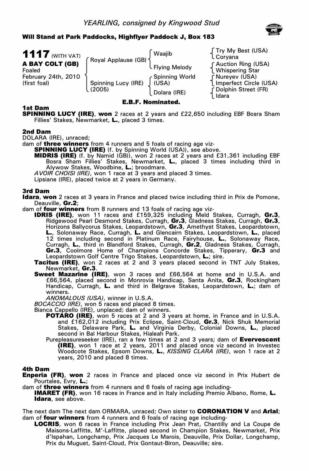 October Yearling Sale, Book 2 2012 lot 1093 C. by Lawman (FR) 2011, Hillwood Stud=>Vendor 10,000 gns