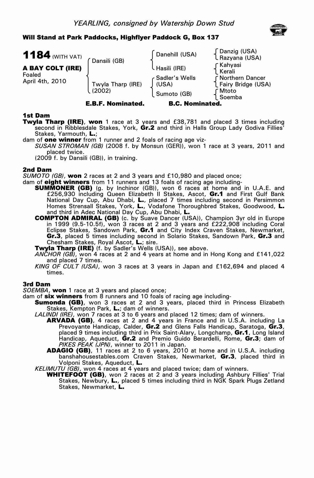 October Yearling Sale, Book 1 2012 lot 314 C. by Danehill Dancer (IRE) 2011, Watership Down Stud=>Highflyer Bloodstock 110,000 gns