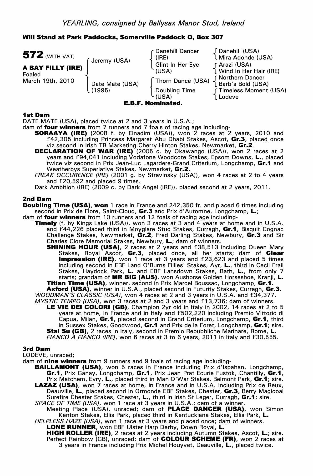 December Foal Sale 2001 lot 806 C. by Stravinsky (USA) , Ballysax Manor Stud, Ireland (Agent)=>J Railton 16,000 gns