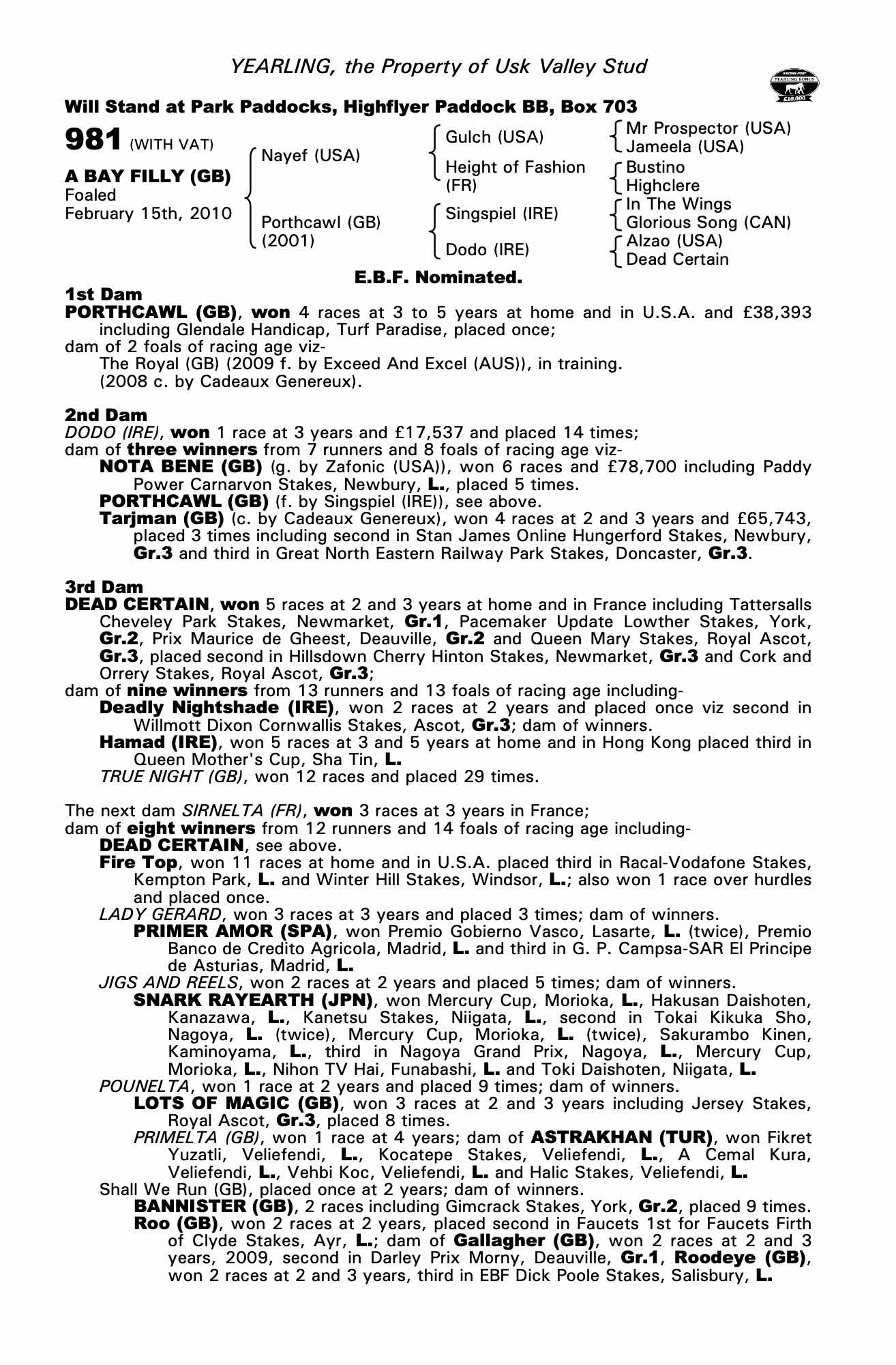 October Yearling Sale, Book 2 2018 lot 599 F. by New Approach (IRE) 2017, Usk Valley Stud=>Suzanne Roberts / D Elsworth 30,000 gns