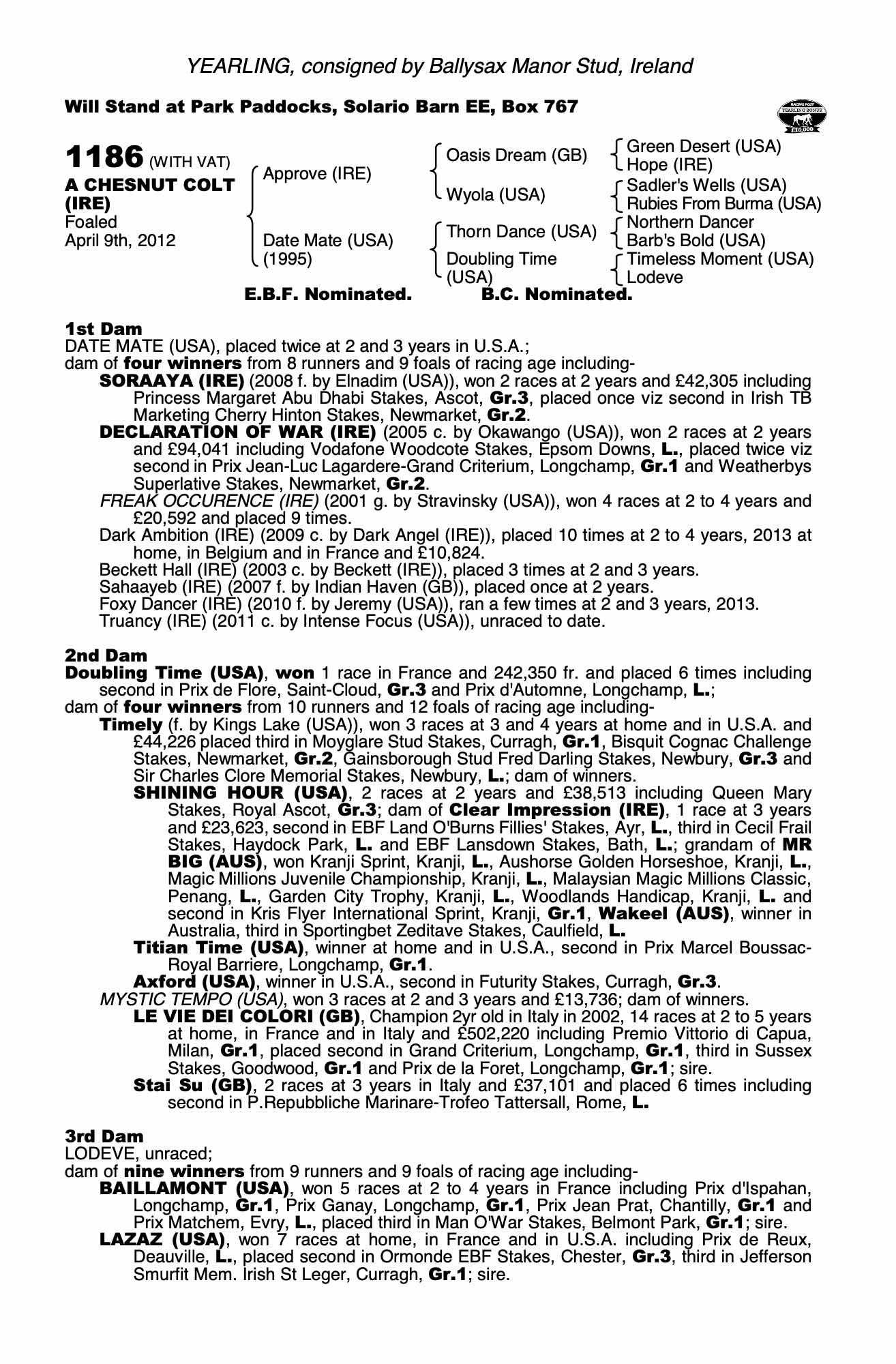 December Foal Sale 2001 lot 806 C. by Stravinsky (USA) , Ballysax Manor Stud, Ireland (Agent)=>J Railton 16,000 gns