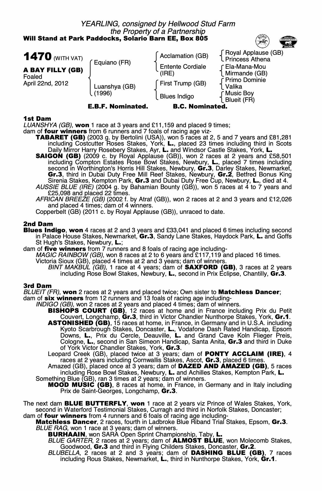 October Yearling Sale, Book 1 2012 lot 87 C. by Royal Applause (GB) 2011, Yeomanstown Stud, Ireland=>Cormac McCormack Bloodstock 50,000 gns
