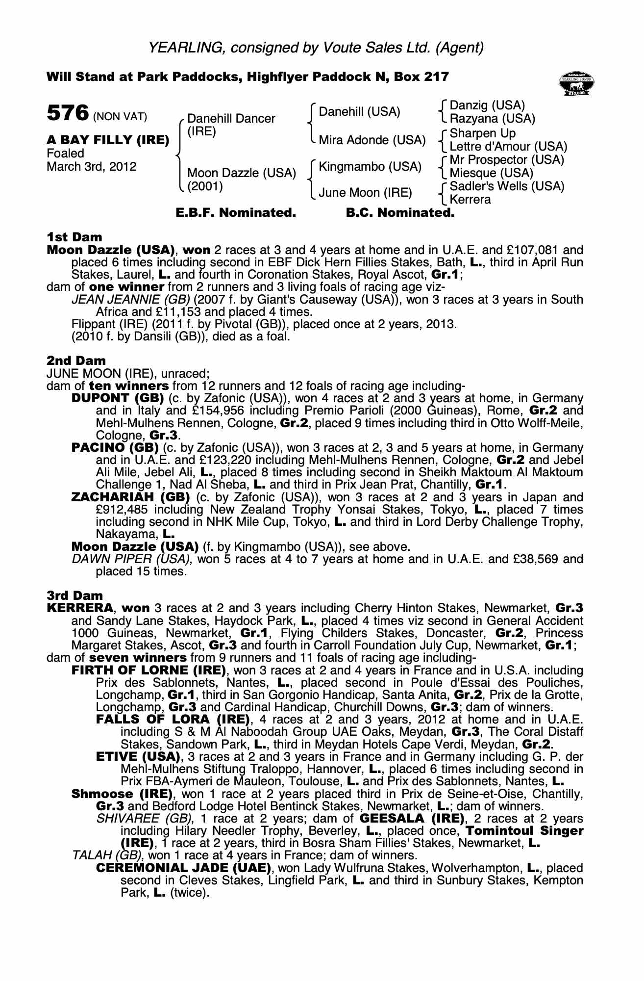 October Yearling Sale, Book 1 2012 lot 133 F. by Pivotal (GB) 2011, Barronstown Stud, Ireland=>Vendor 110,000 gns