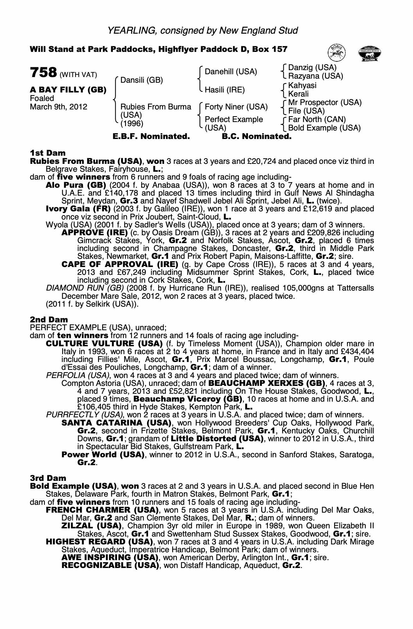 October Yearling Sale, Book 2 2012 lot 1006 F. by Selkirk (USA) 2011, Watership Down Stud=>Ferrybank Properties 33,000 gns