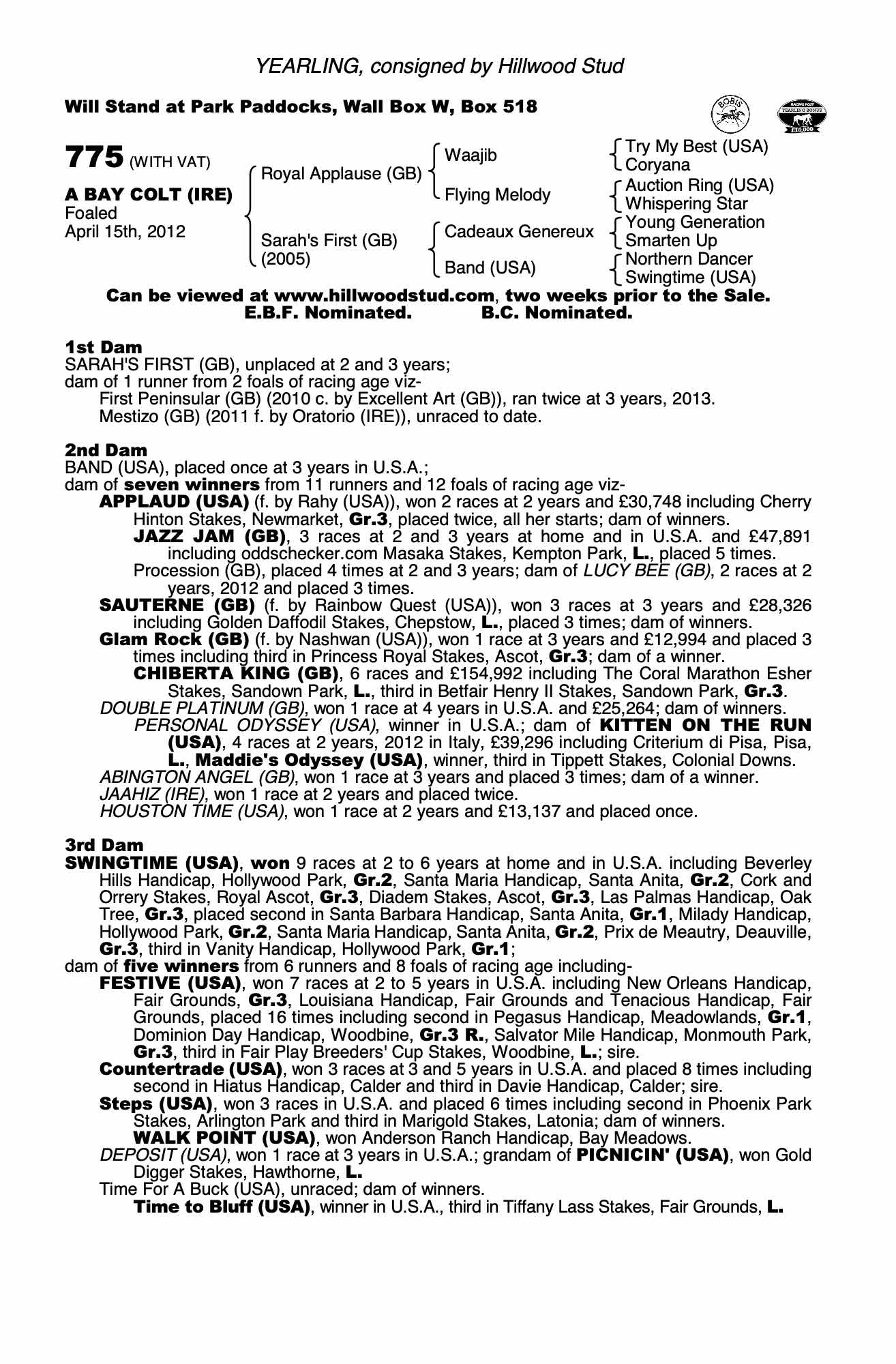 October Yearling Sale, Book 3 2012 lot 1711 F. by Oratorio (IRE) 2011, Jamie Railton, Agent=>Vendor 9,000 gns