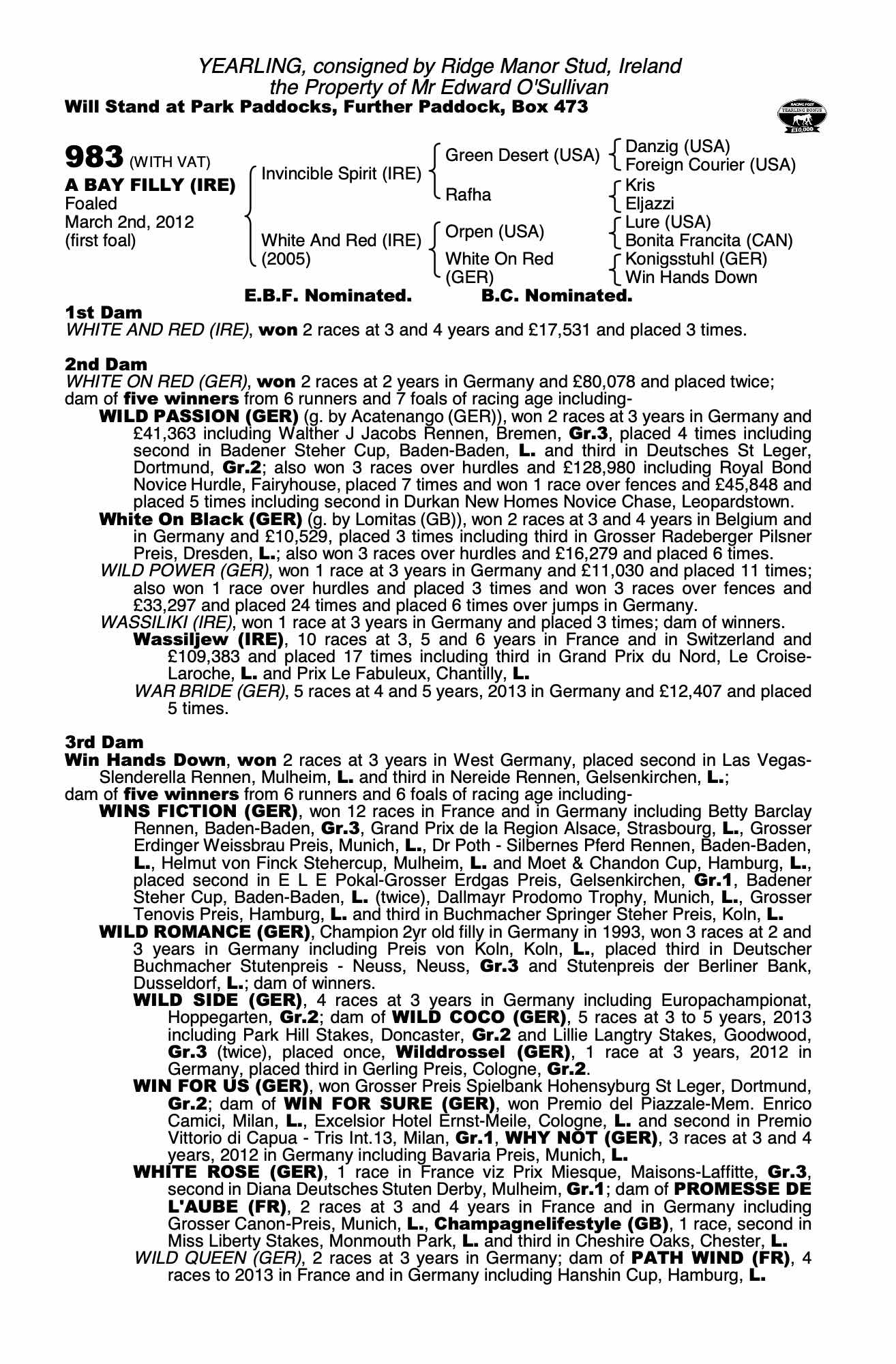 Wednesday 18 September:  Under 3rd dam: WILD COCO (GER), second in Prix Vermeille, Longchamp, Gr.1, Wilddrossel (GER), third in Preis des Casino Baden-Baden, Baden-Baden, L.