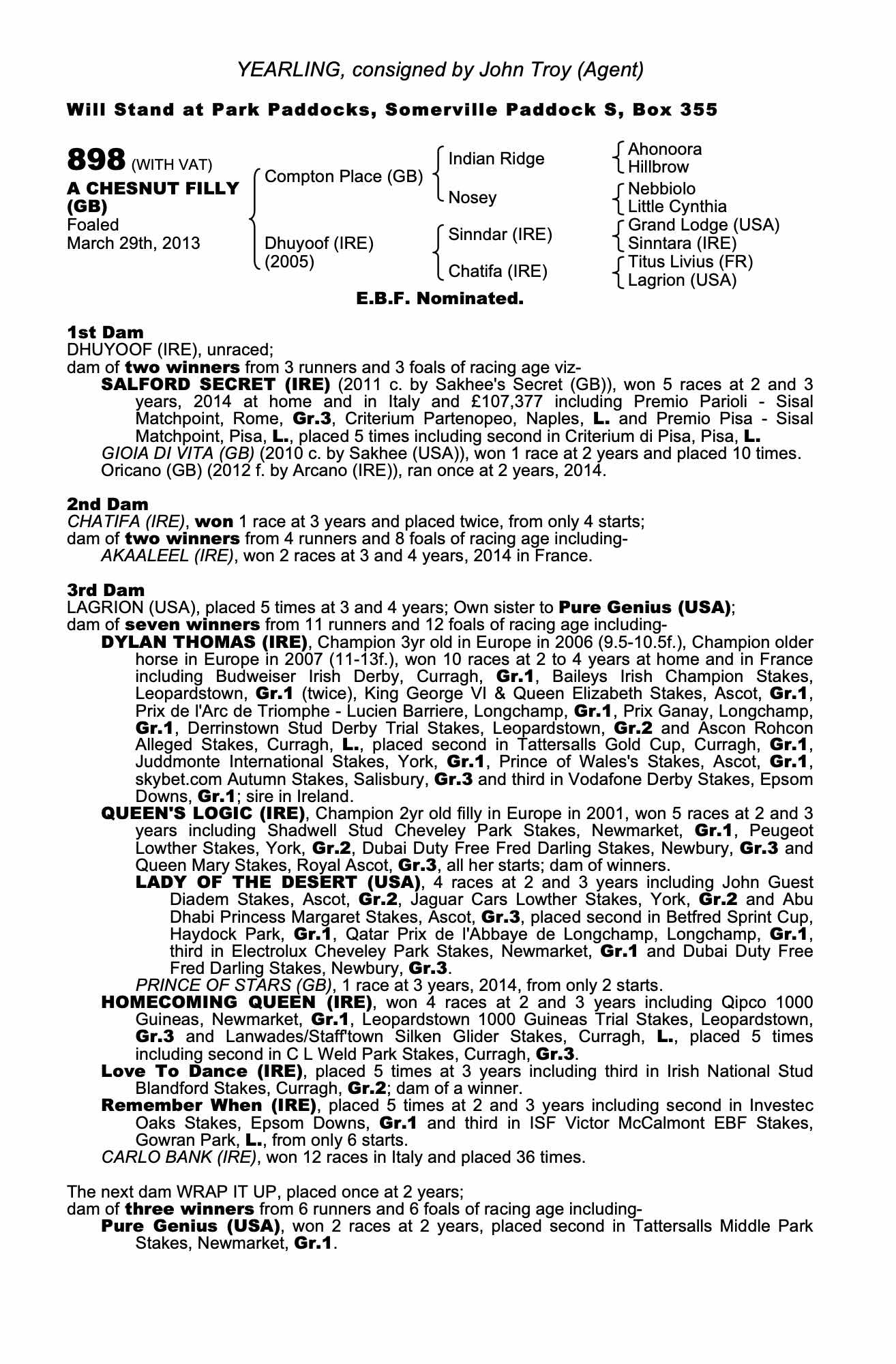 October Yearling Sale, Book 3 2013 lot 1700 F. by Arcano (IRE) 2012, John Troy, Agent=>Karen Tutty 3,500 gns