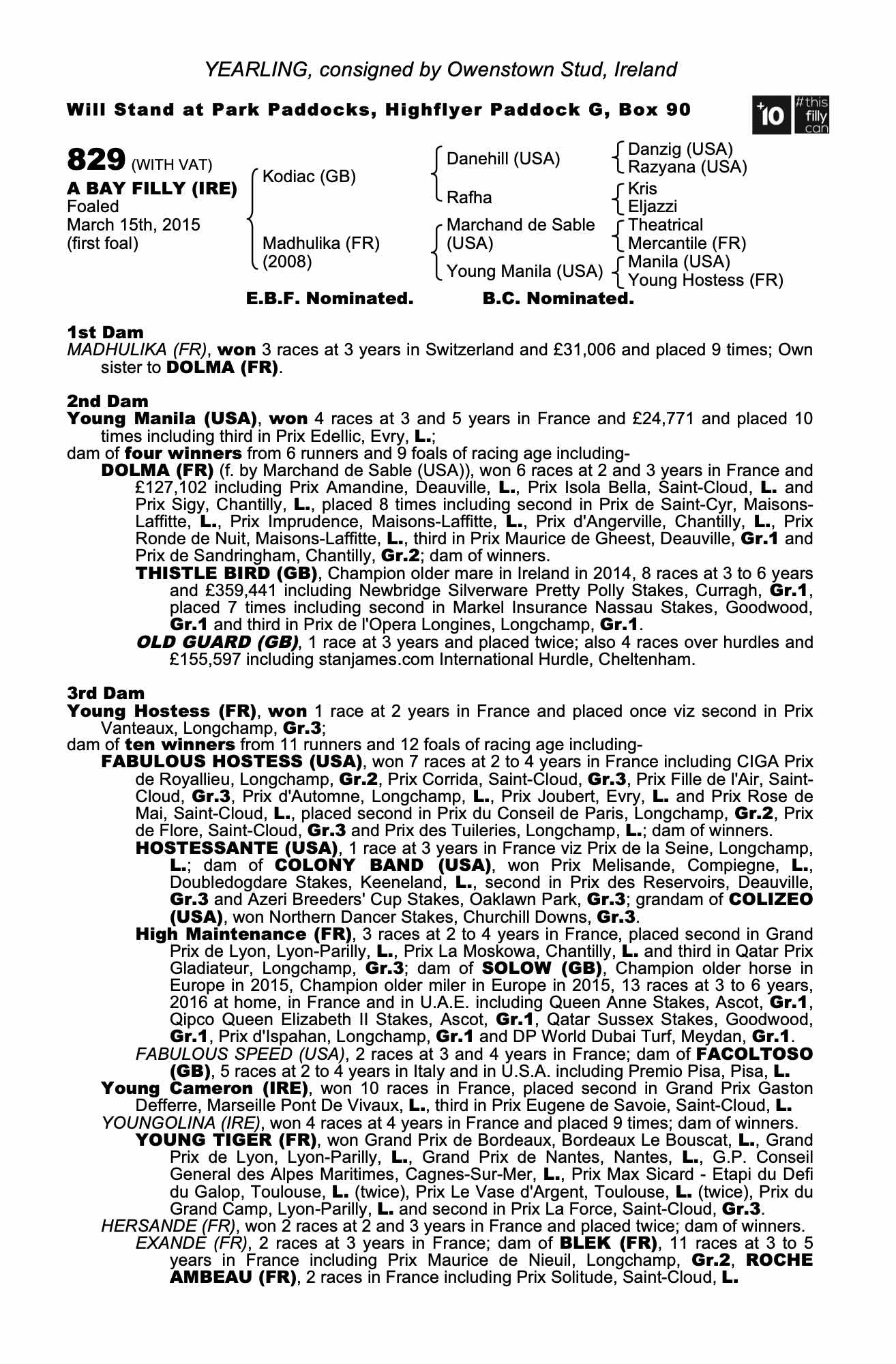 Under 2nd Dam, DOLMA (FR), dam of MCCREERY (GB), won 5 races at 2 to 4 years, 2016 inc. Kingston Town Stakes, Rosehill, Gr.3.