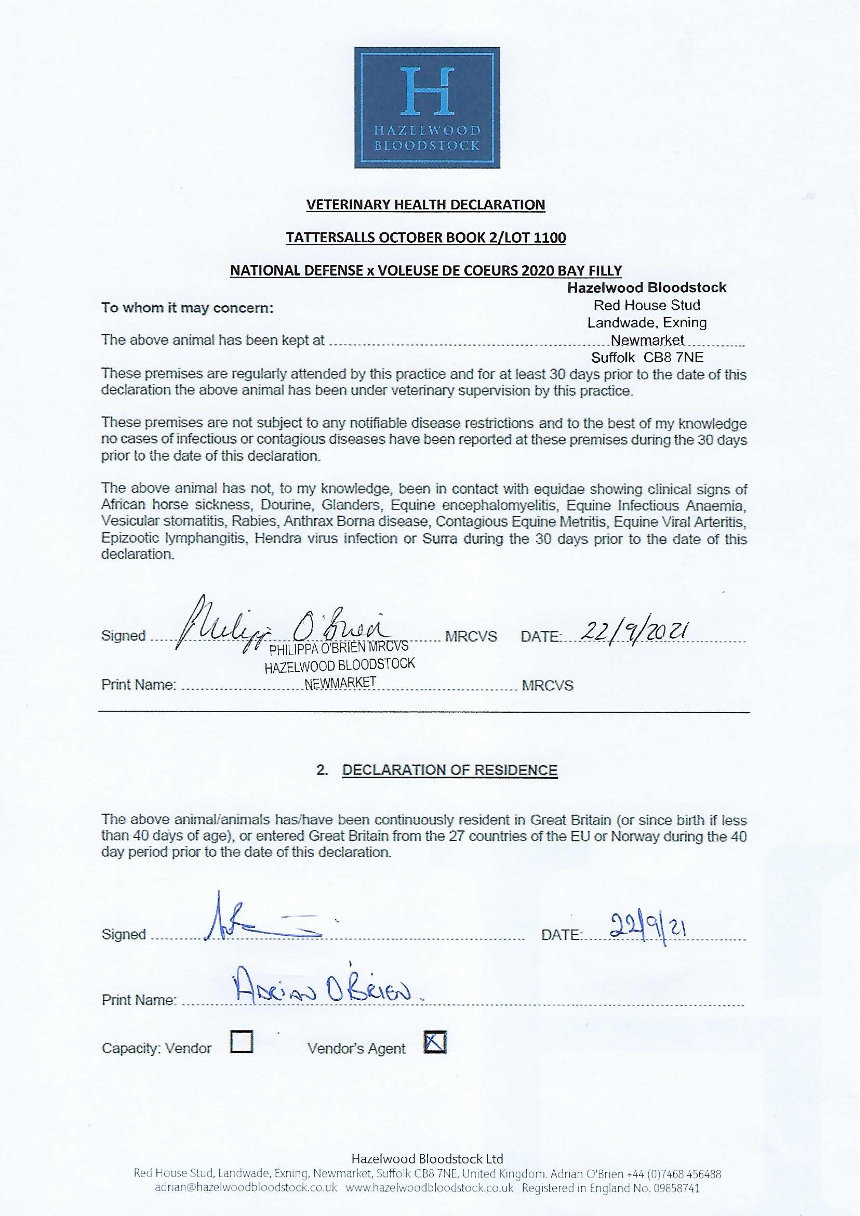 Contact: Adrian O'Brien ✆ +447468456488 ✉ adrian@hazelwoodbloodstock.co.uk