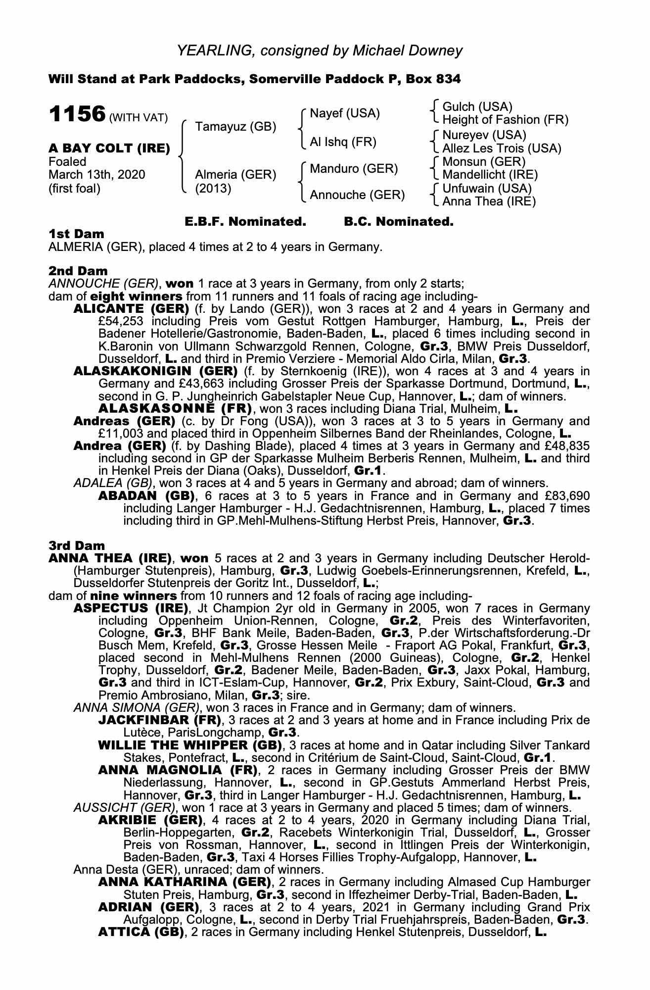 Under 3rd Dam: AKRIBIE (GER), won Grosser Preis von Rossman, Hannover, L., placed second Taxi 4 Horses Fillies Trophy, Hannover, L.