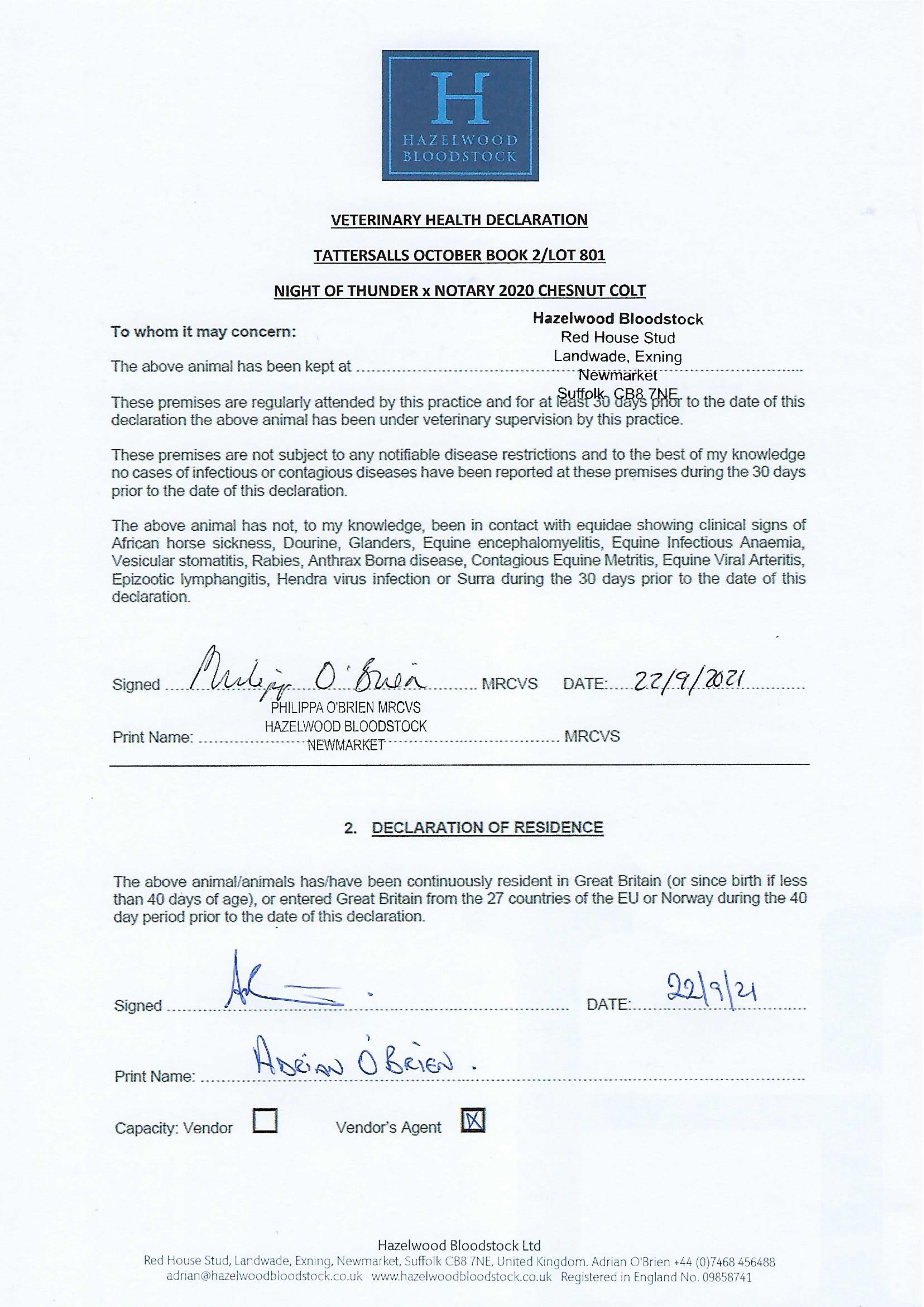 Contact: Adrian O'Brien ✆ +447468456488 ✉ adrian@hazelwoodbloodstock.co.uk