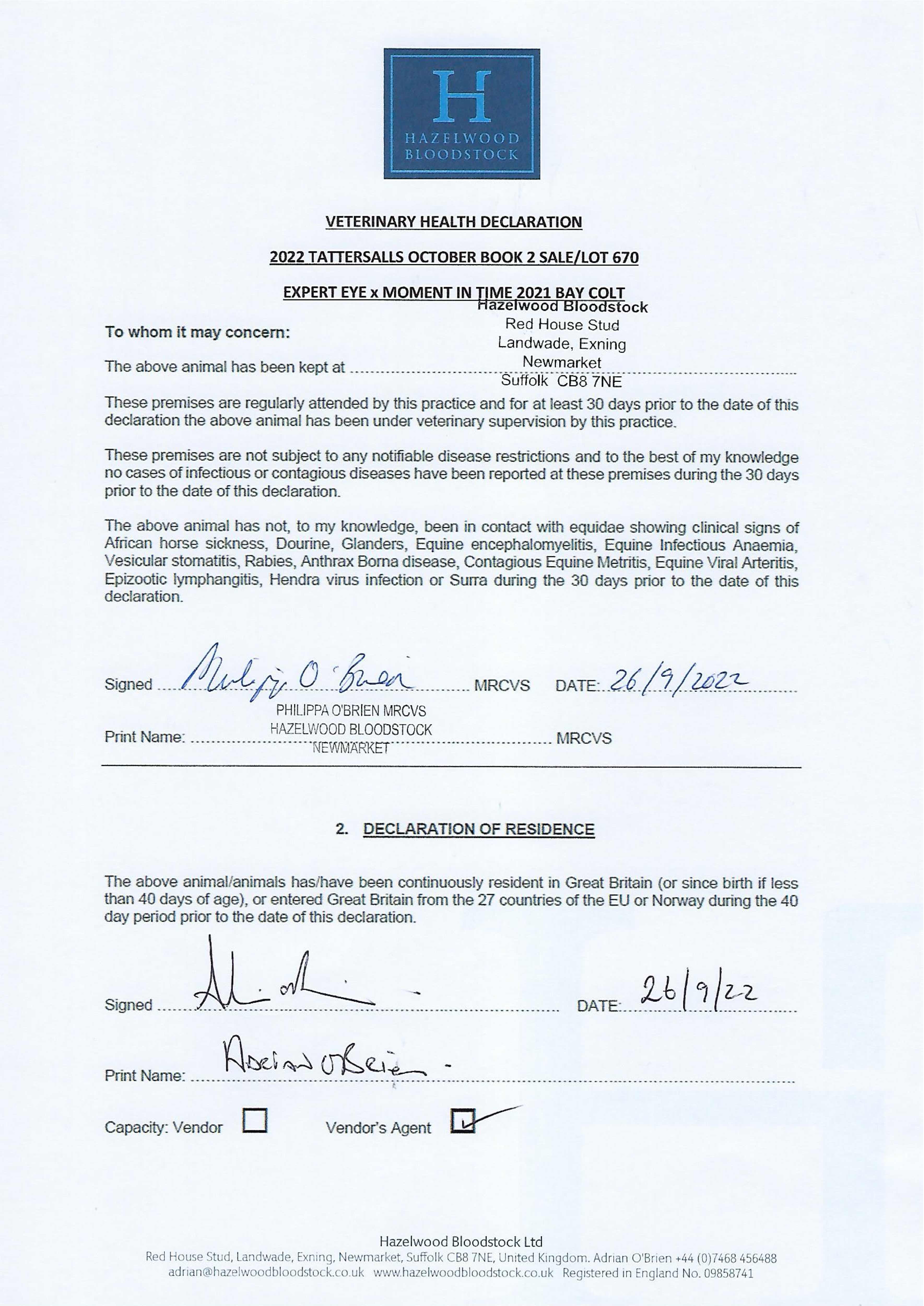 Contact: Adrian O'Brien ✆ +447468456488 ✉ adrian@hazelwoodbloodstock.co.uk