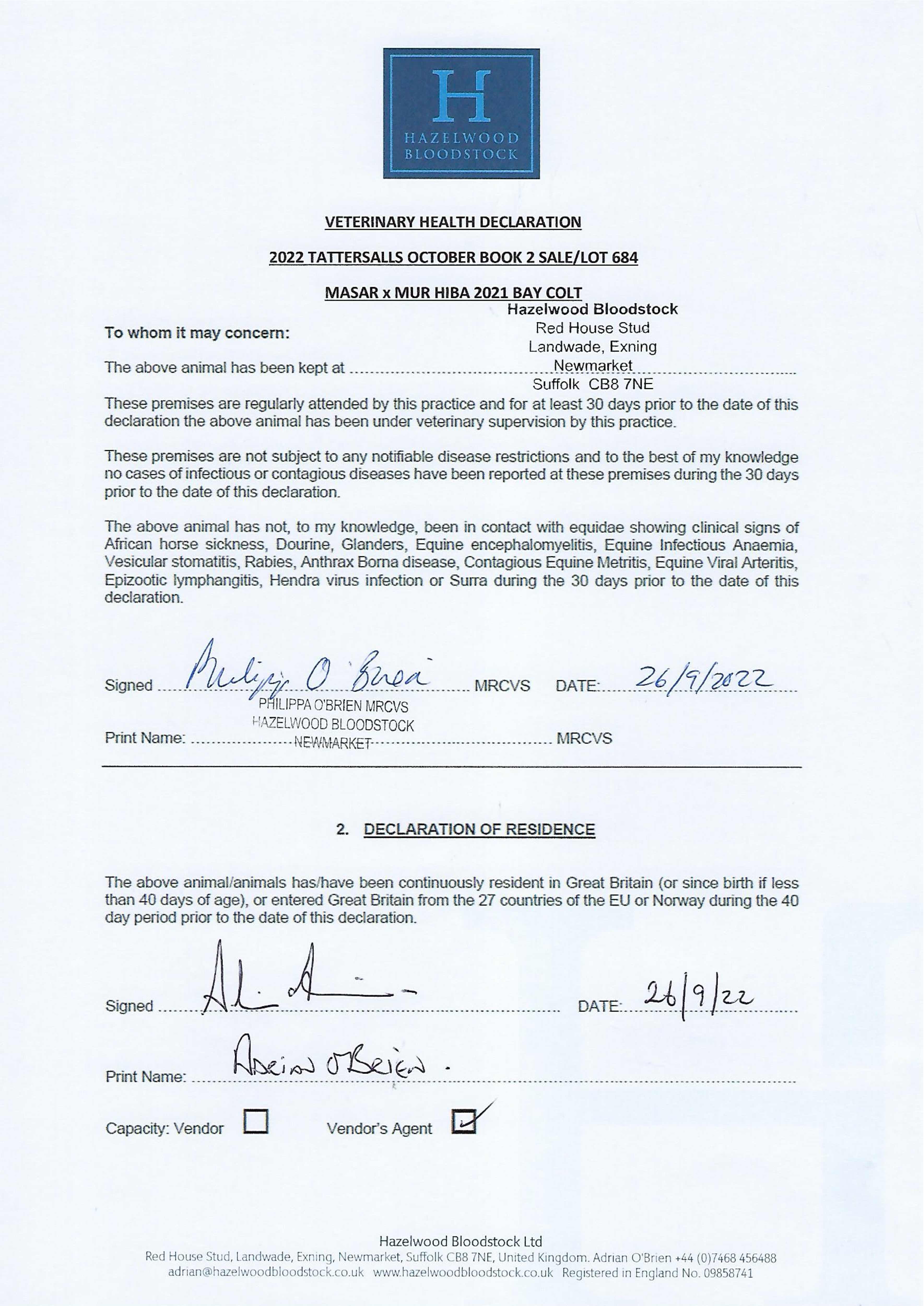 Contact: Adrian O'Brien ✆ +447468456488 ✉ adrian@hazelwoodbloodstock.co.uk