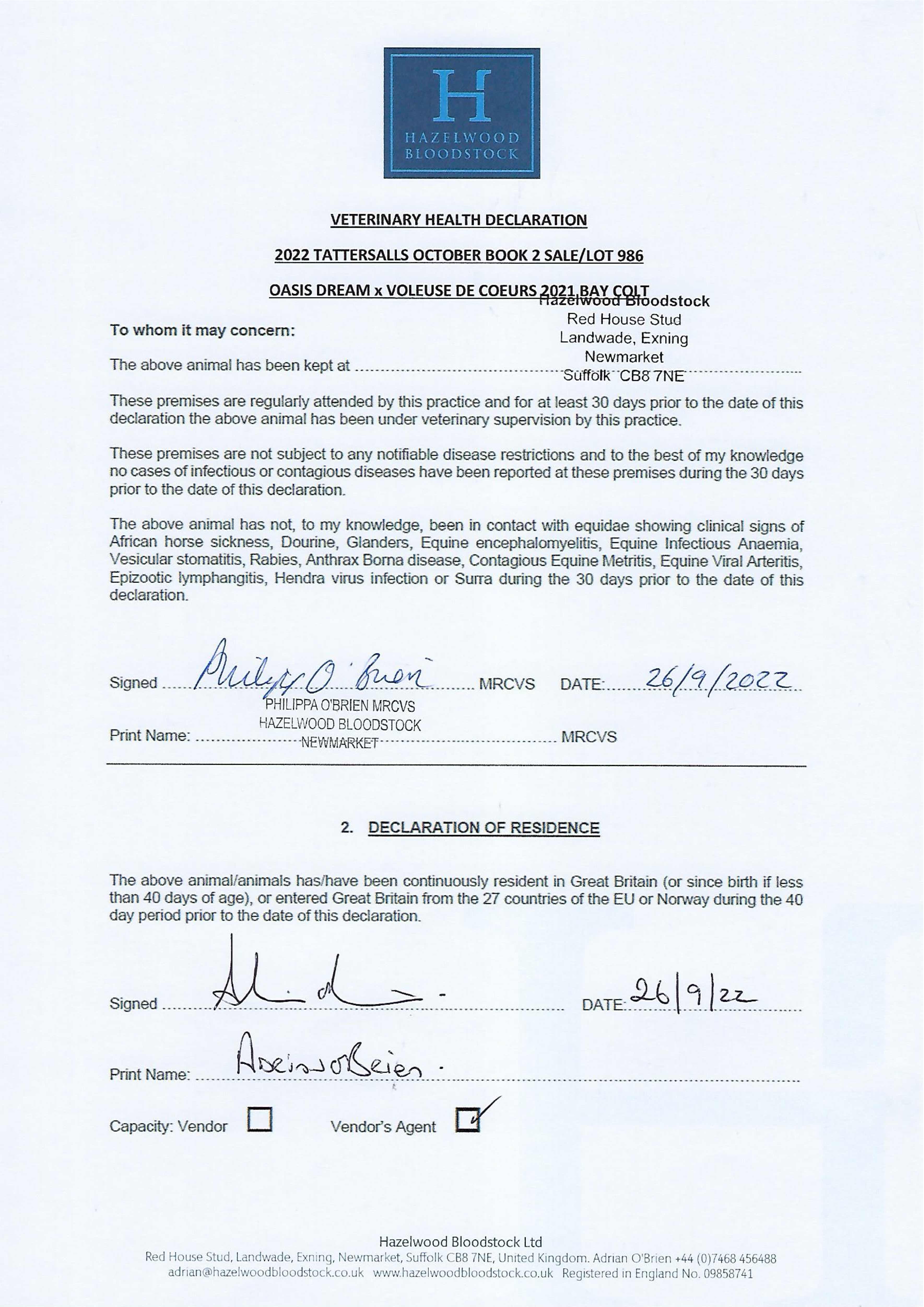 Contact: Adrian O'Brien ✆ +447468456488 ✉ adrian@hazelwoodbloodstock.co.uk
