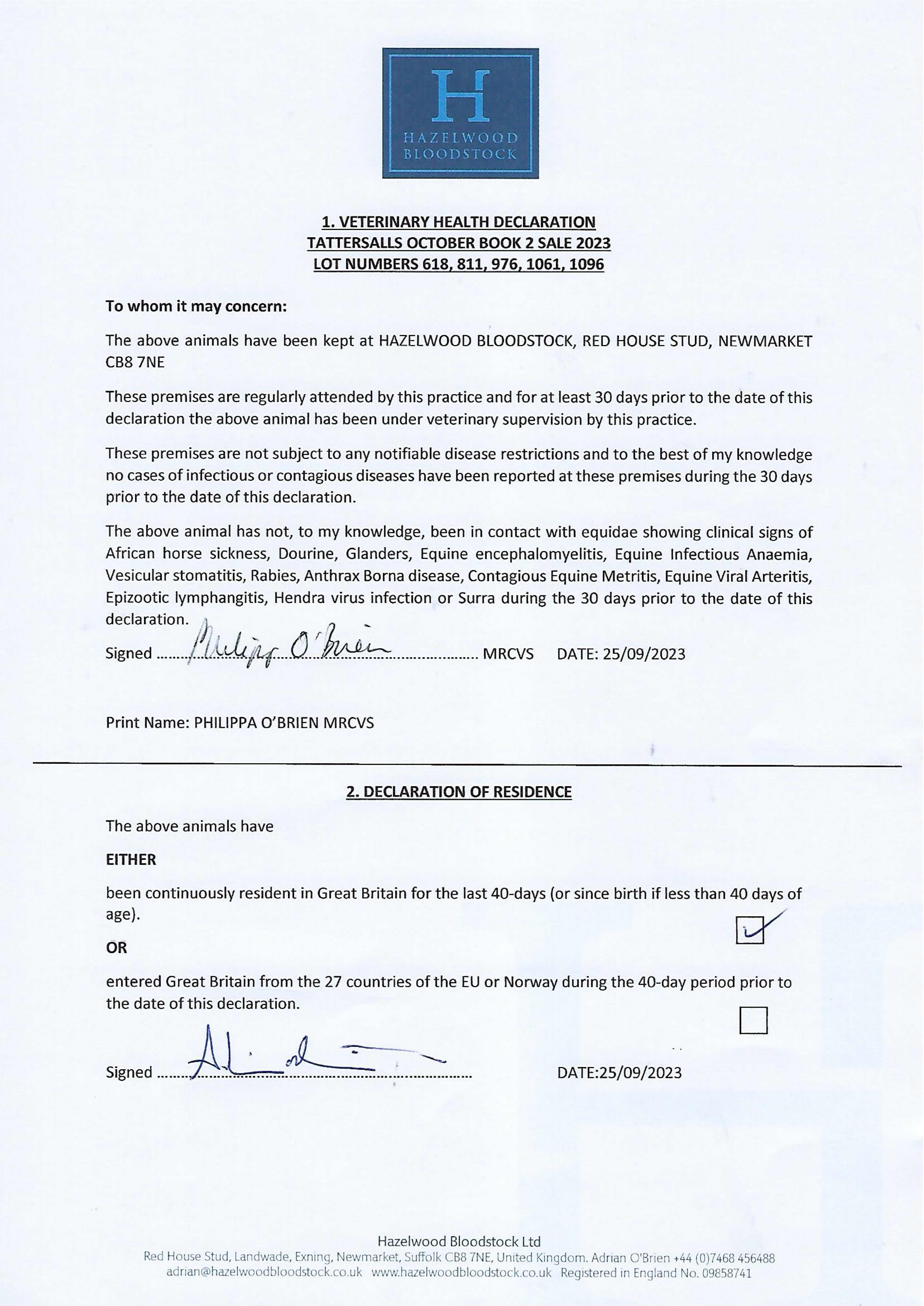 Contact: Adrian O'Brien ✆ 07468456488 ✉ adrian@hazelwoodbloodstock.co.uk
