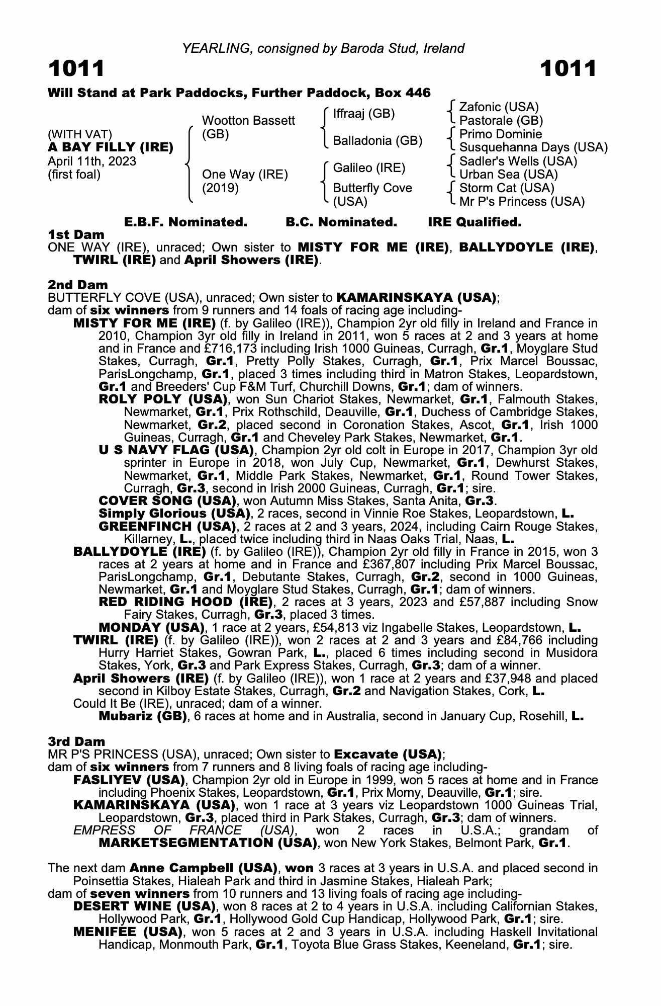 Under 2nd dam, TWIRL (IRE), grandam of TENMA (USA), won Del Mar Debutante Stakes, Del Mar, Gr.1.