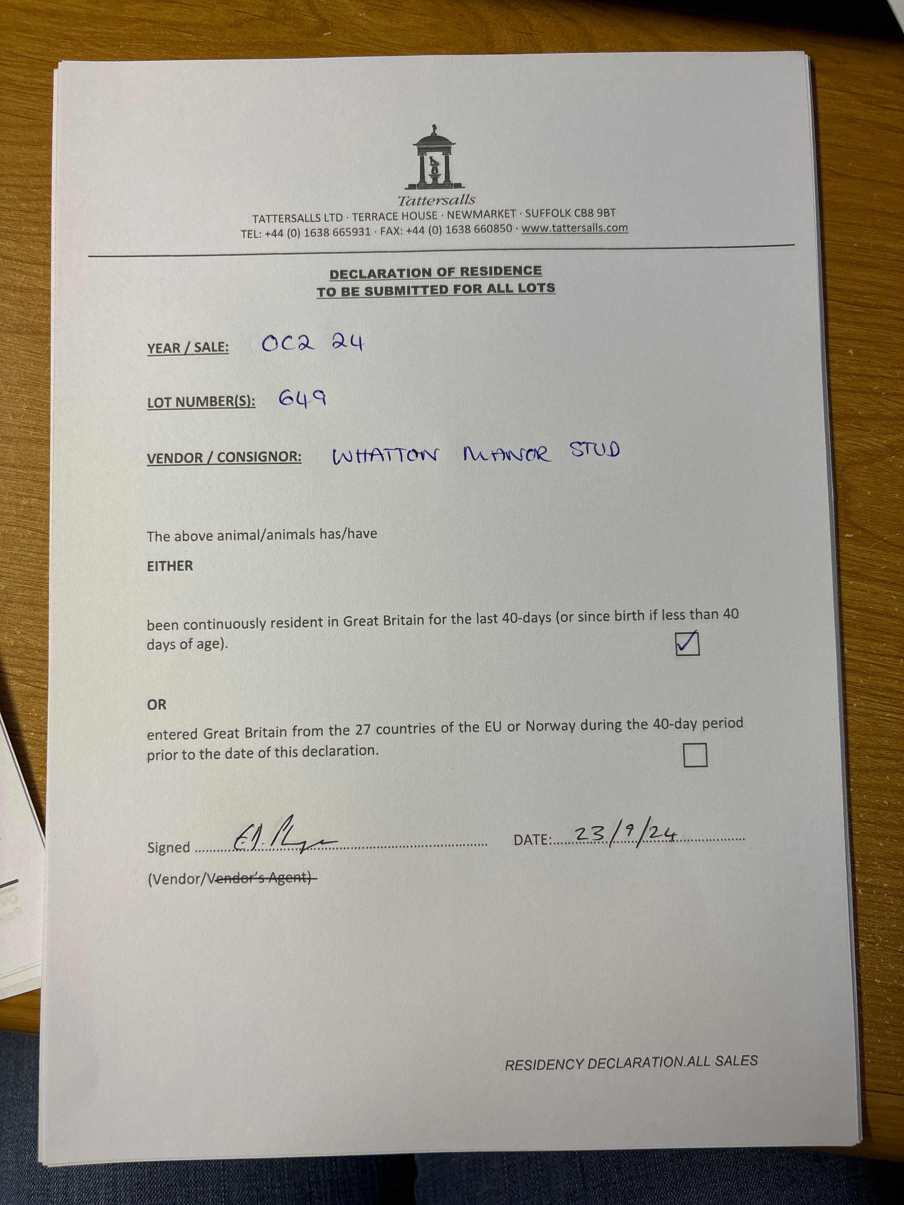 Consignor: Whatton Manor Stud