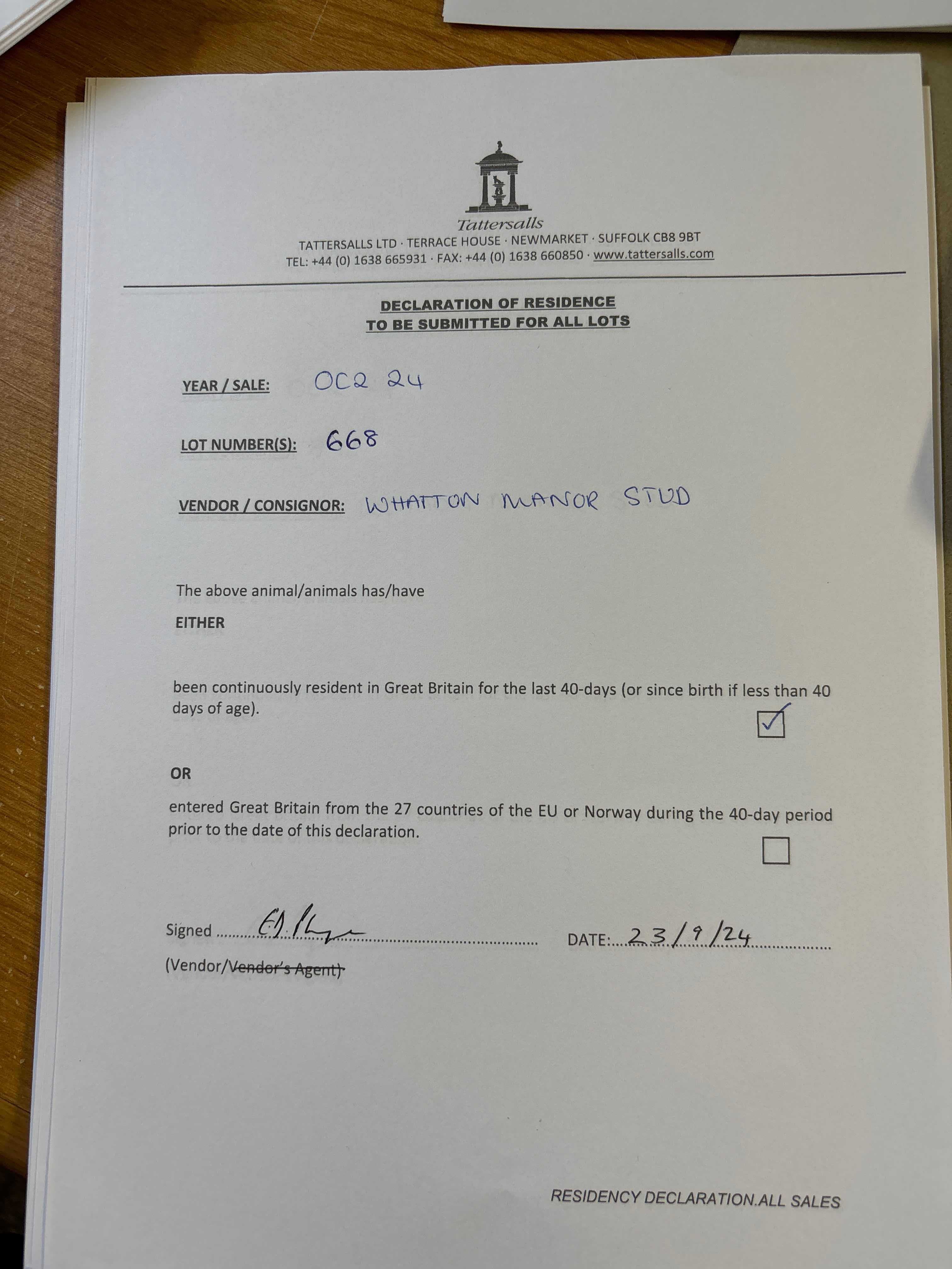 Consignor: Whatton Manor Stud