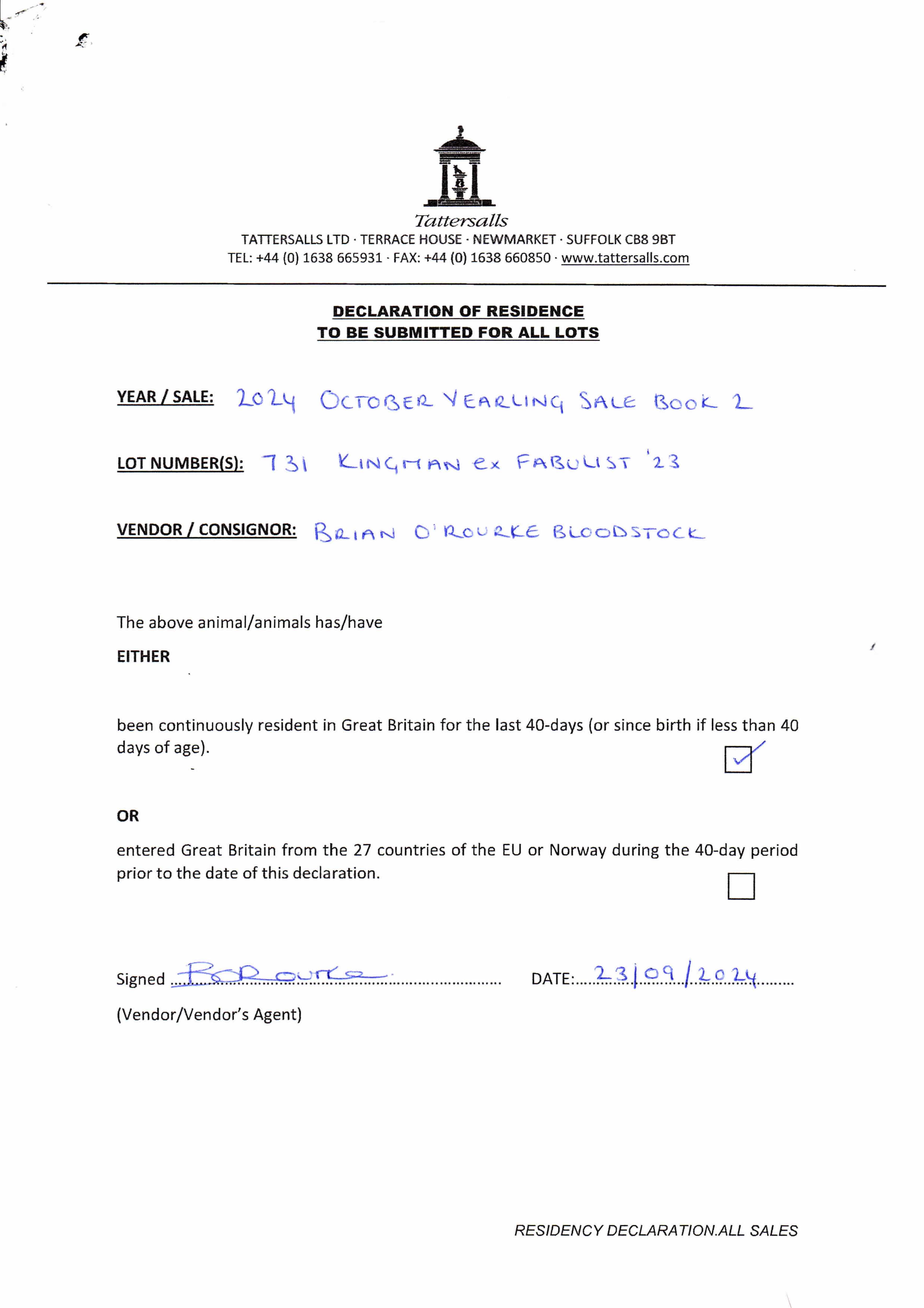 Contact: Brian O'Rourke ✆ (+44) 7887716468 ✉ brian@brianorourkebloodstock.com