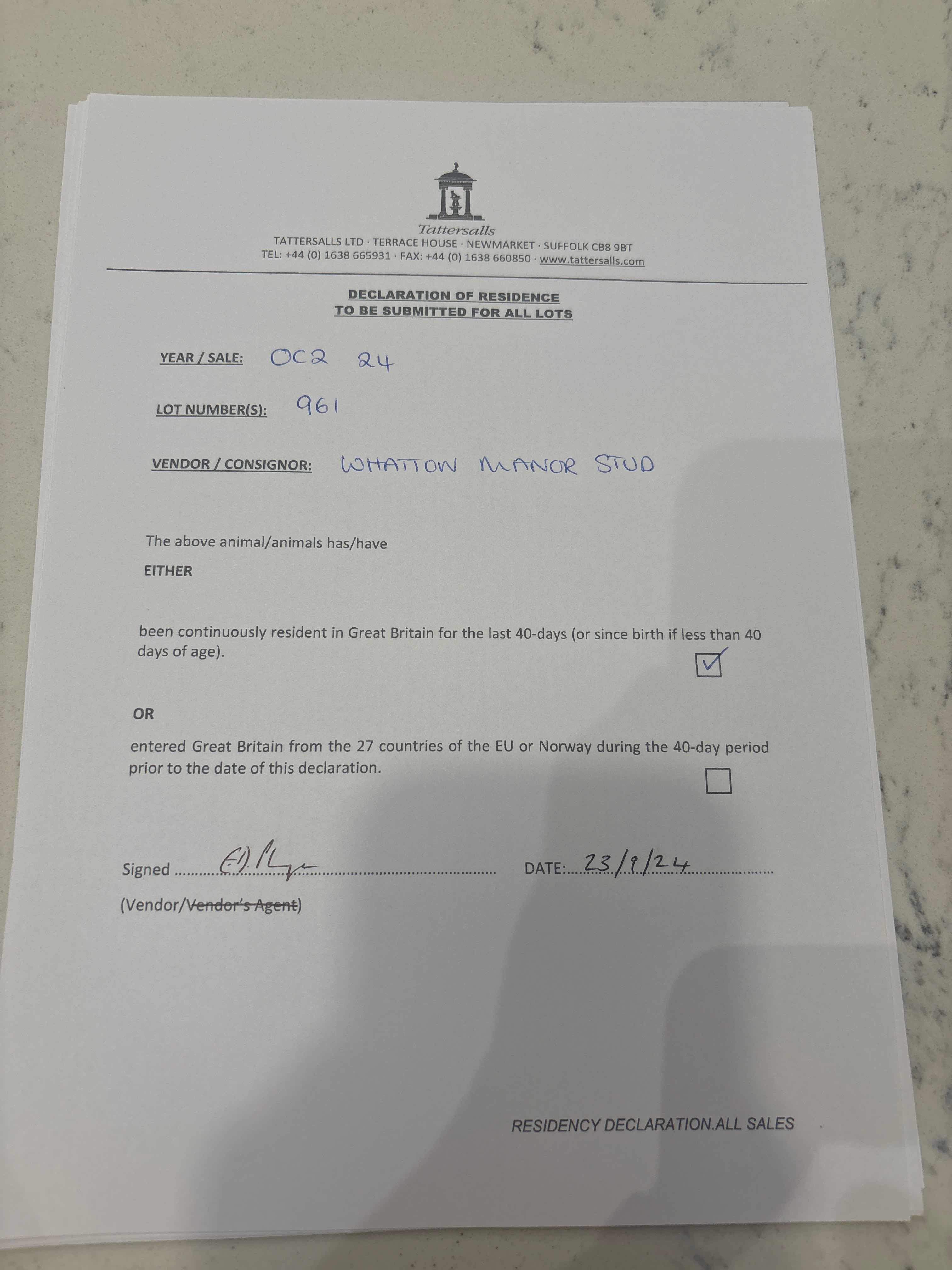 Consignor: Whatton Manor Stud