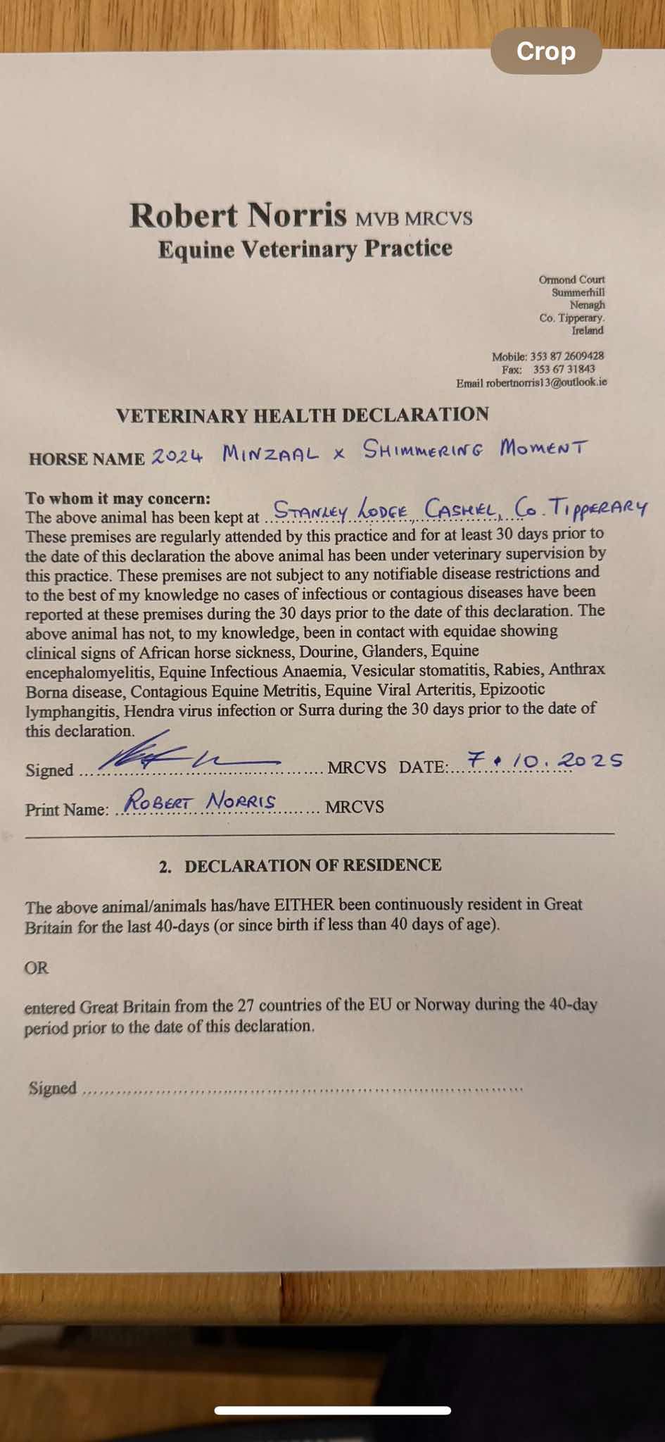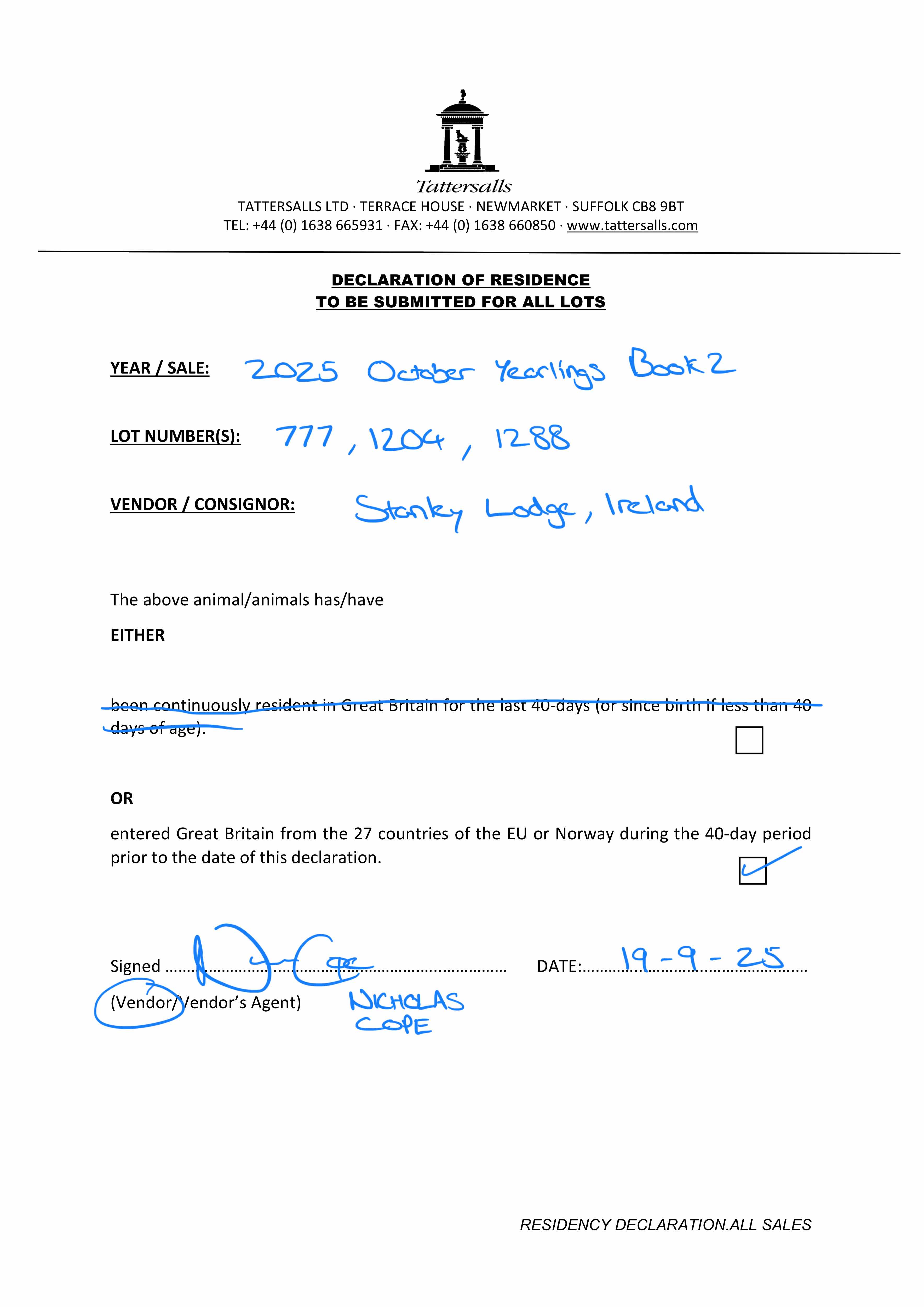 Consignor: Stanley Lodge, Ireland