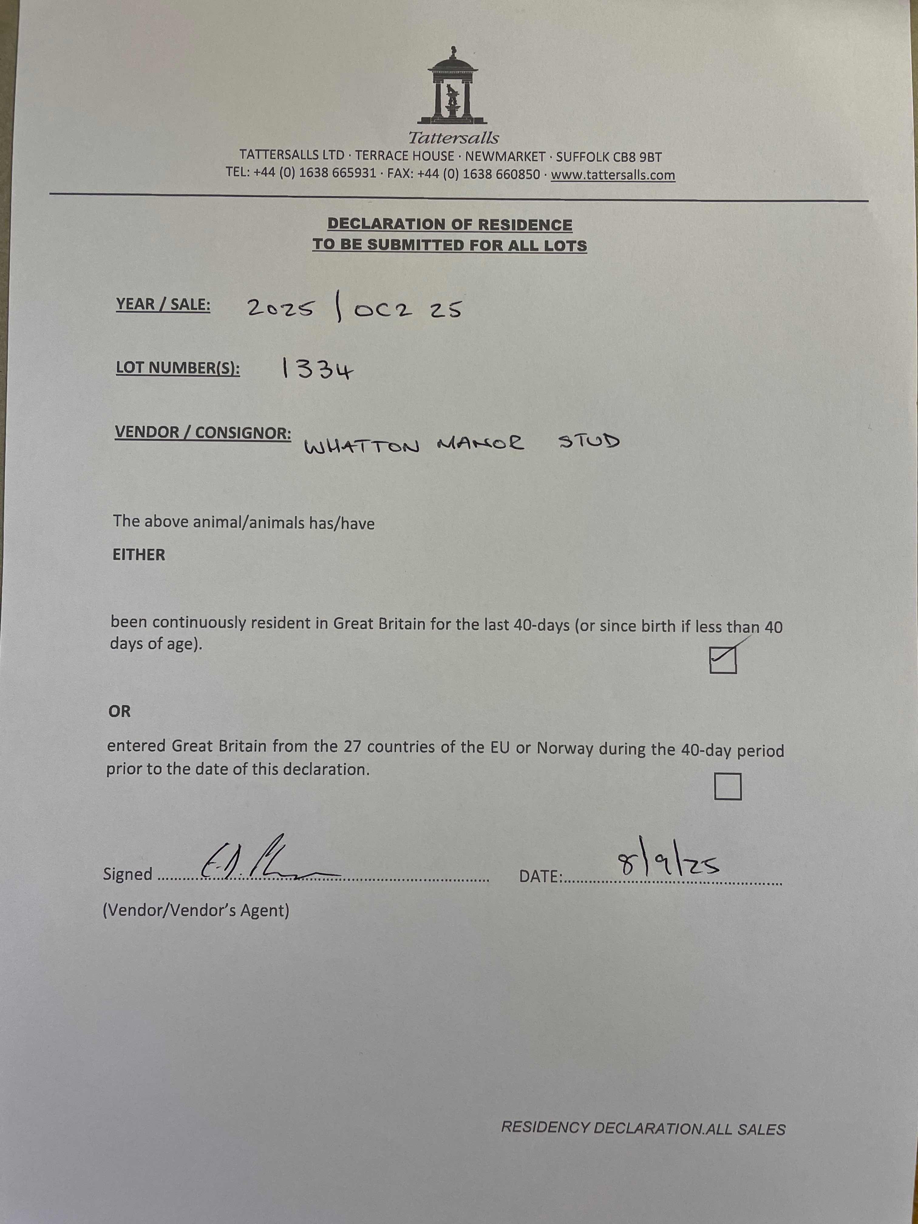 Consignor: Whatton Manor Stud
