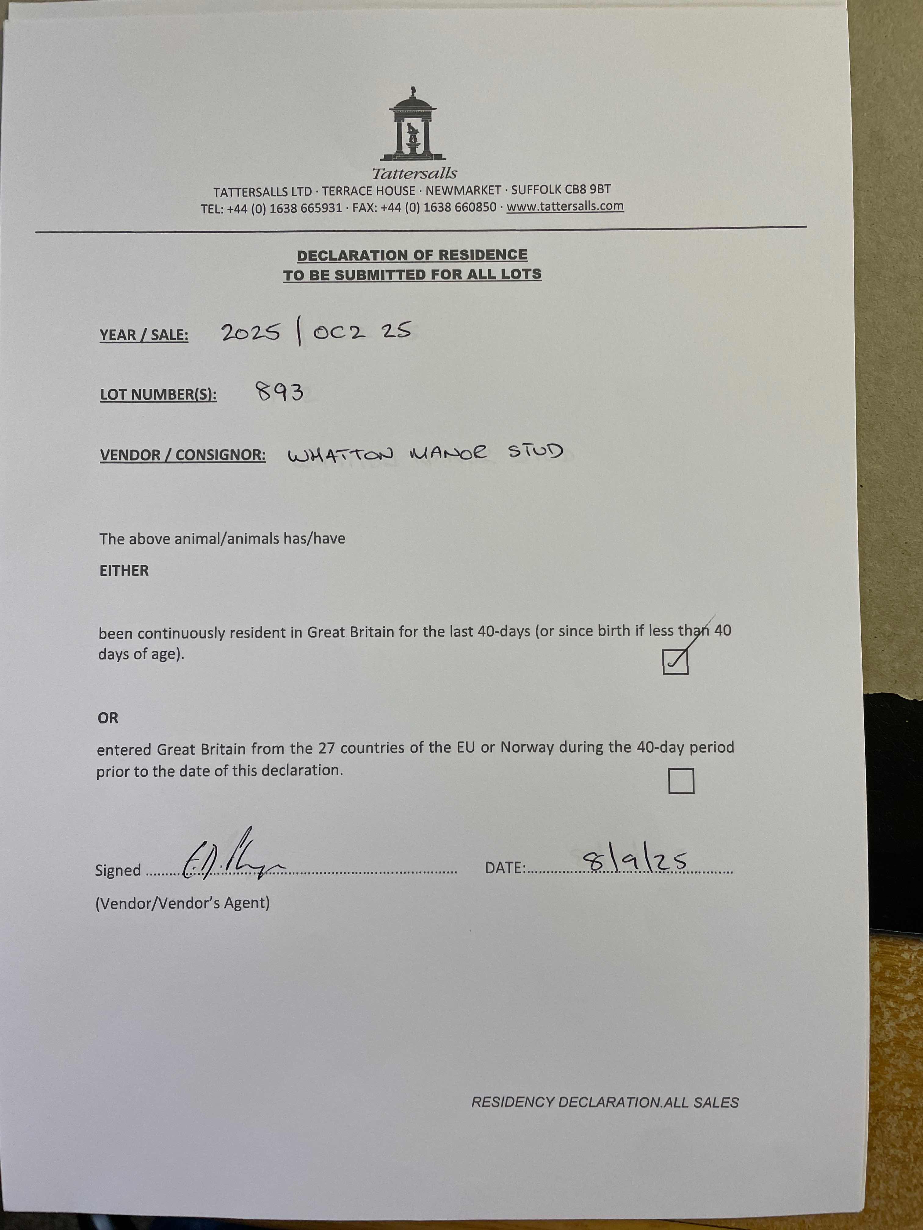 Consignor: Whatton Manor Stud