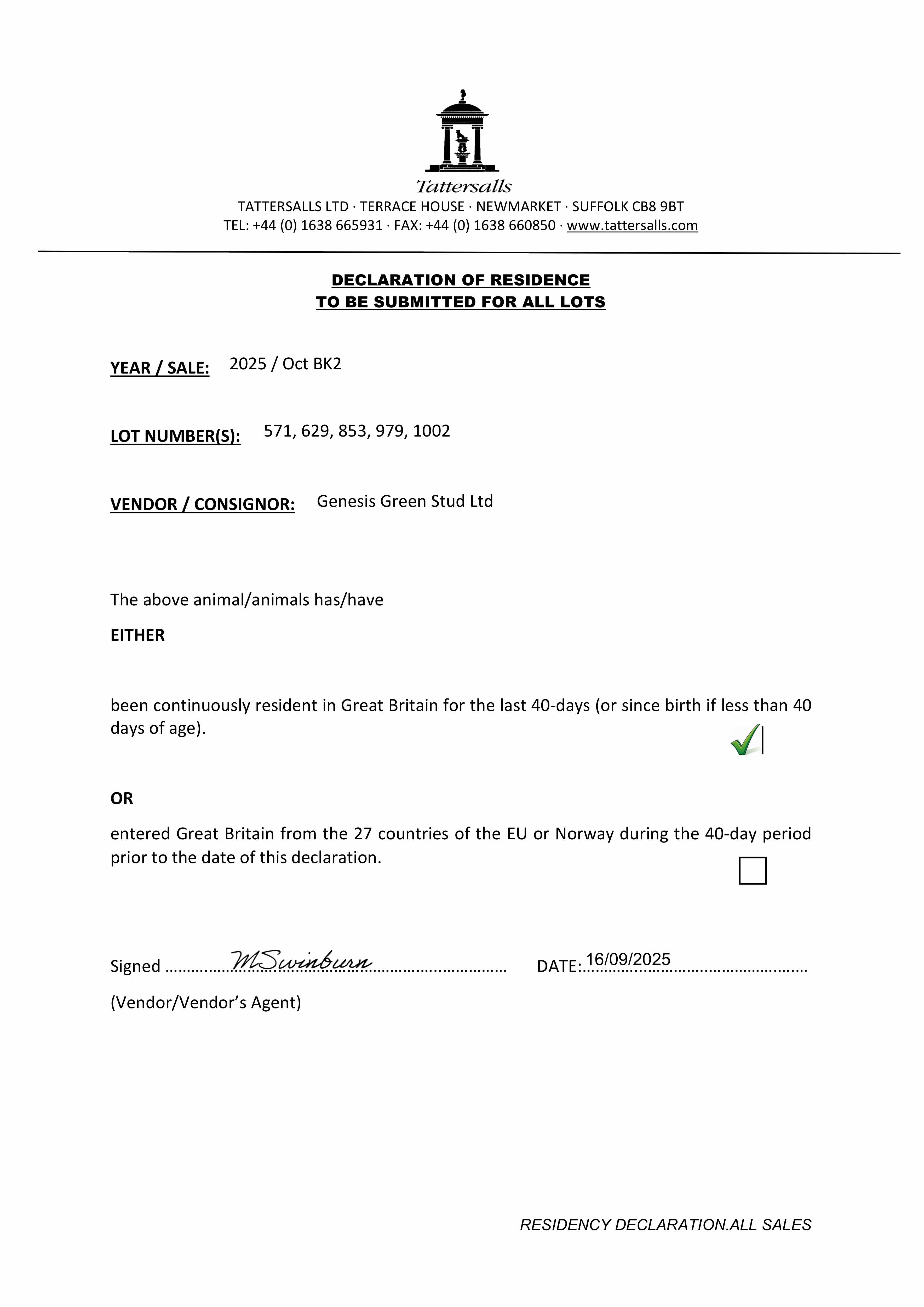 Consignor: Genesis Green Stud Ltd.