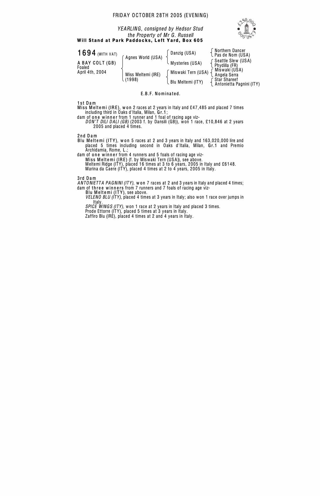 October Yearling Sale, Book 2 2004 lot 1020 F. by Dansili (GB) 2003, Hedsor Stud=>Stanley Moore 7,500 gns