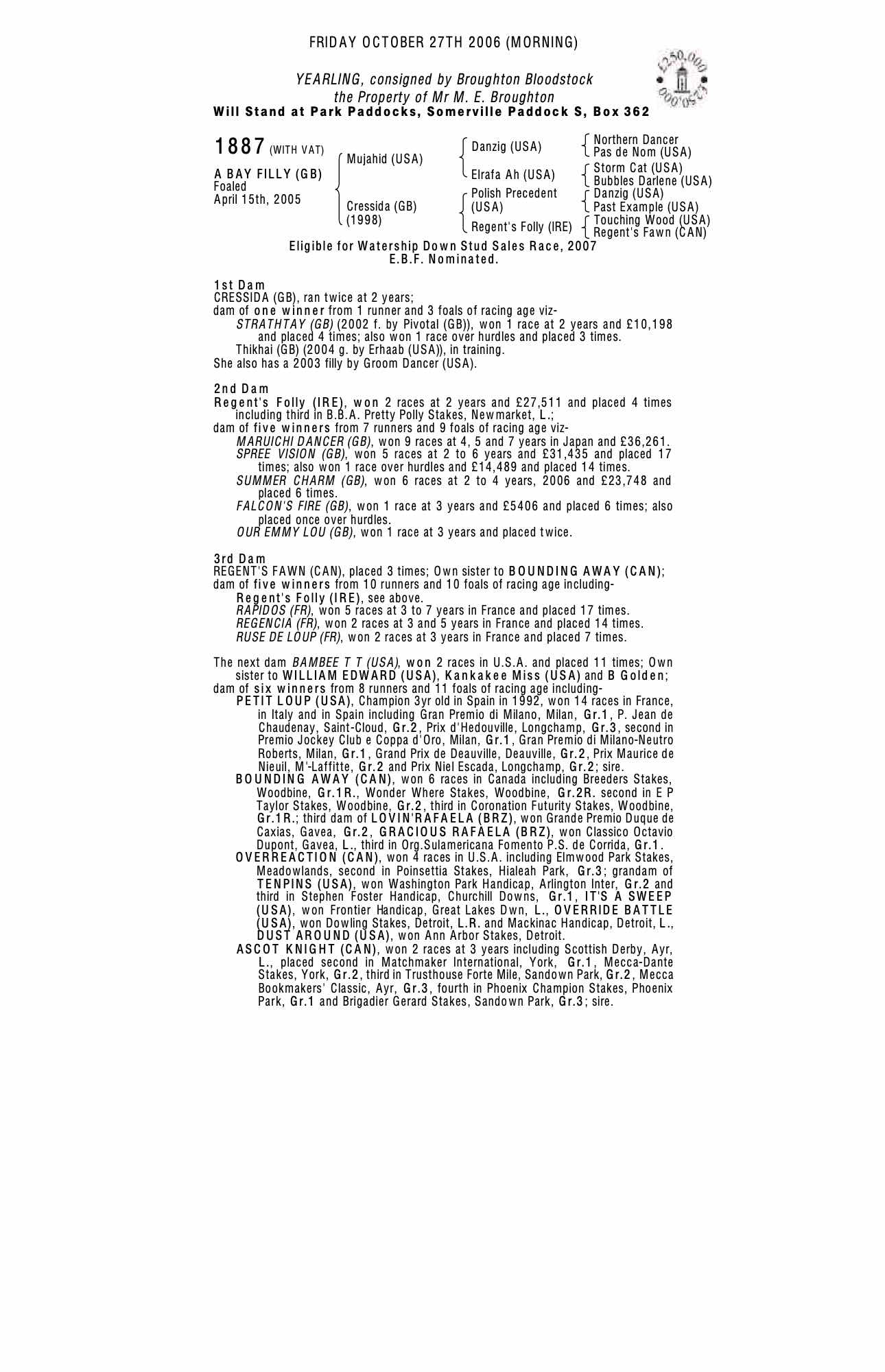 September Yearling Sale 2007 lot 261 F. by Kyllachy (GB) 2006, Cormackstown Stud=>Vendor €16,000