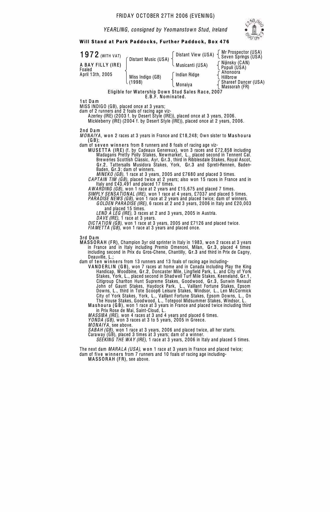 October Yearling Sale, Book 3 2007 lot 1448 F. 2006, Yeomanstown Stud, Ireland=>Vendor 5,000 gns