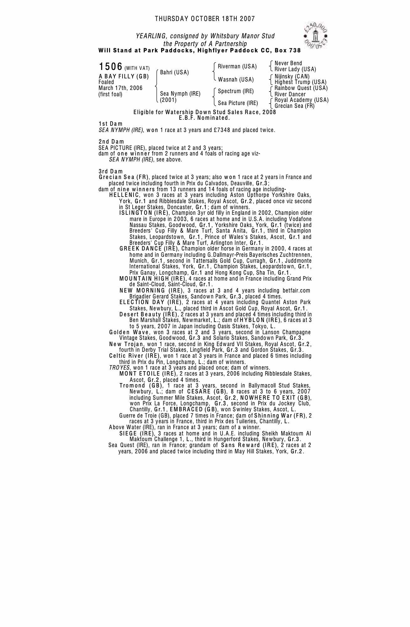 October Yearling Sale, Book 3 2008 lot 1819 F. by Dubawi (IRE) 2007, Whitsbury Manor Stud=>Vendor 1,000 gns
