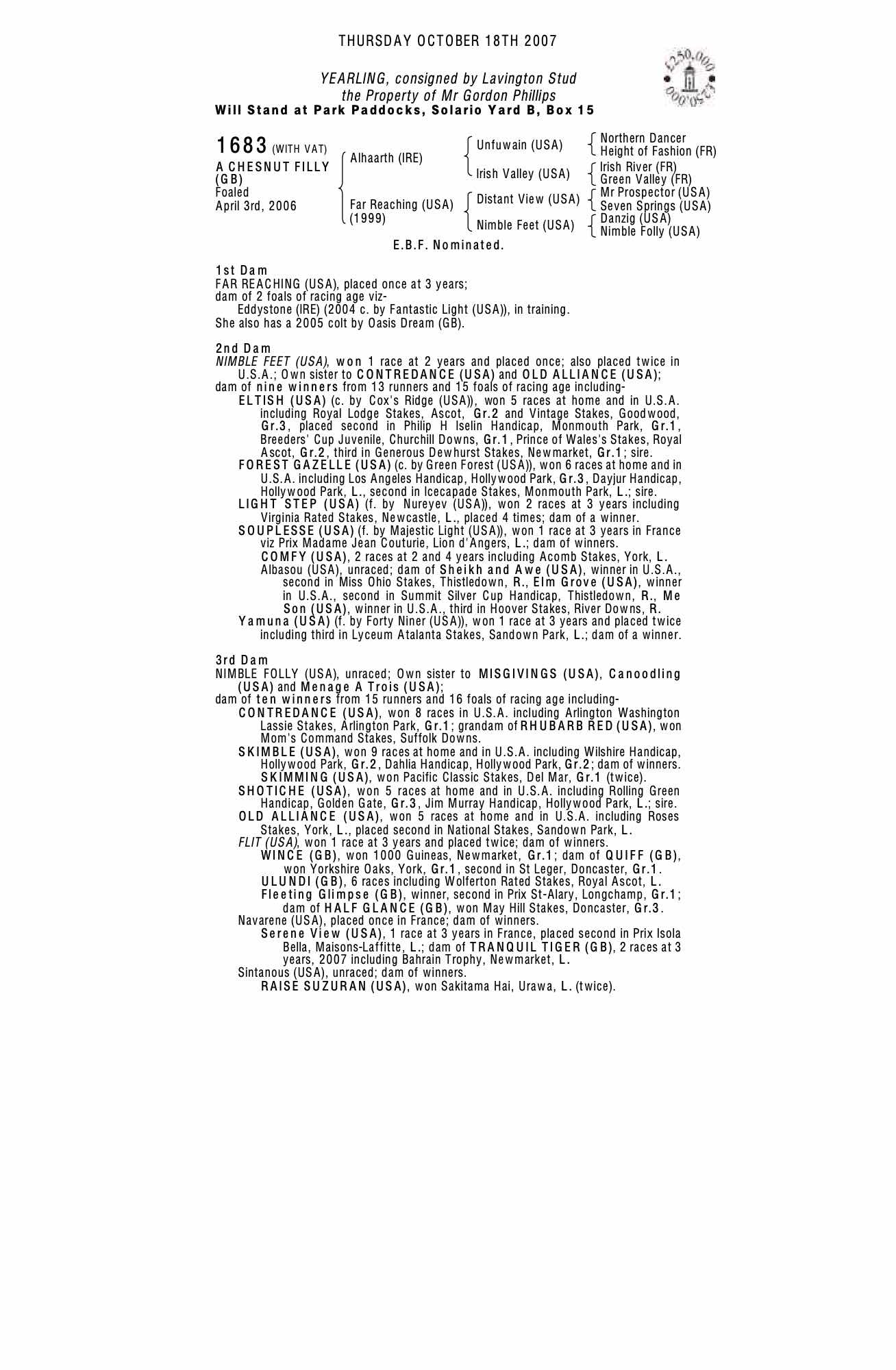 October Yearling Sale, Book 2 2006 lot 1041 C. by Oasis Dream (GB) 2005, Ballymoney Park Stud, Ireland=>Vendor 52,000 gns
