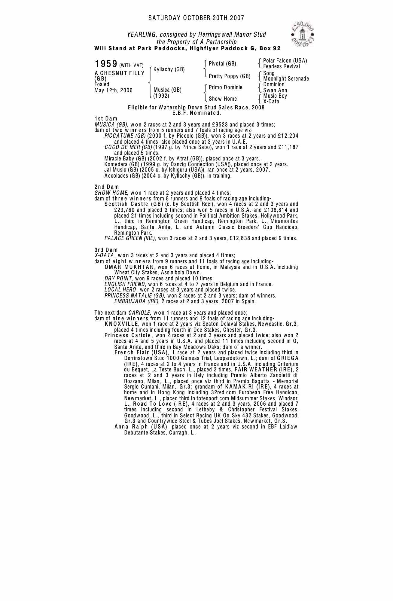 Autumn Yearling Sale 2001 lot 1522 F. by Piccolo (GB) , Lavington Stud=>C Dwyer 6,000 gns