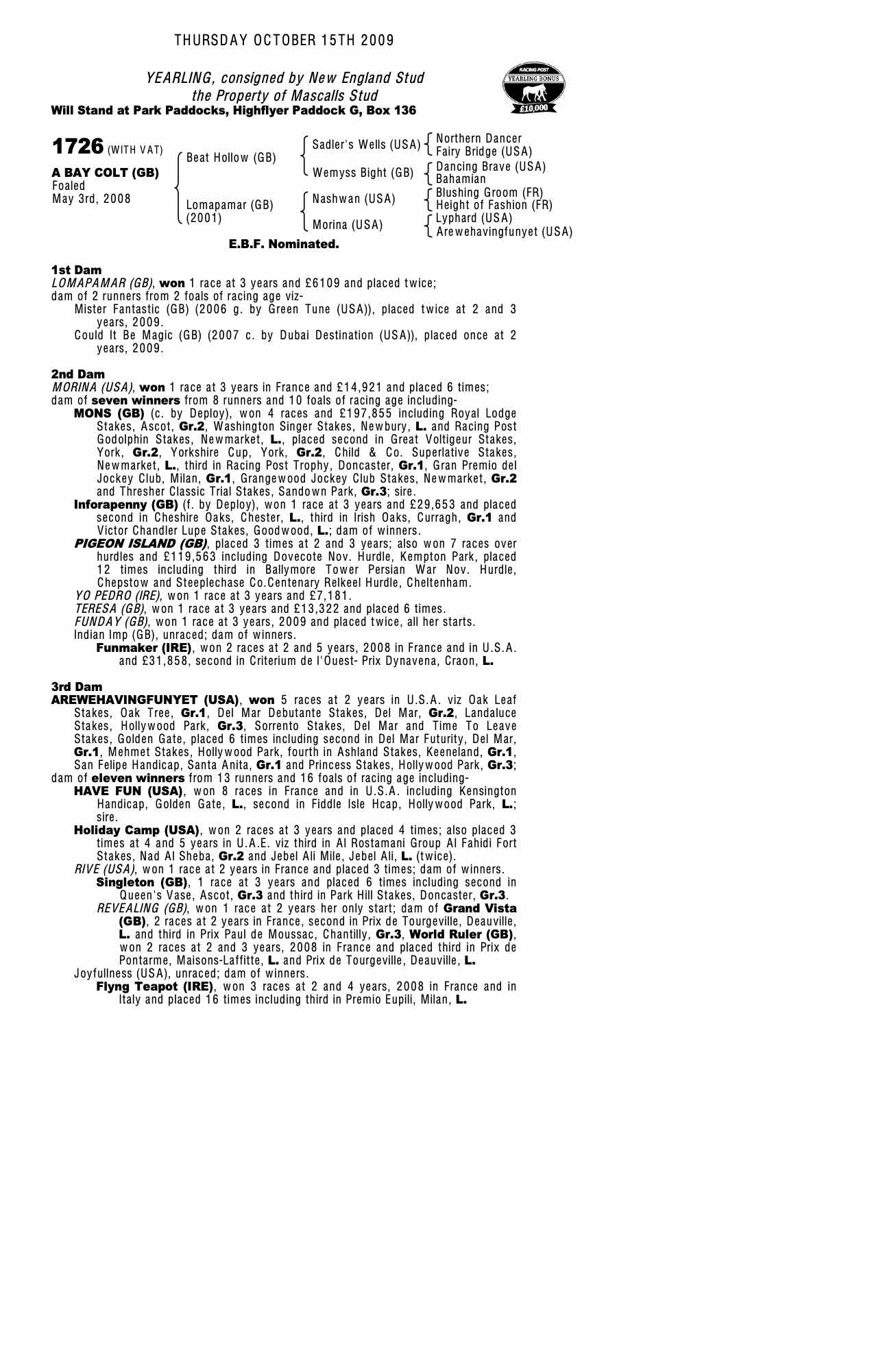 October Yearling Sale, Book 3 2012 lot 1646 C. by Mount Nelson (GB) 2011, New England Stud=>Francesca Turri 7,500 gns