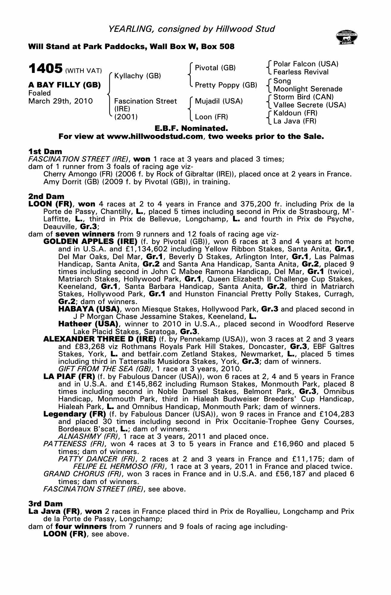 Craven Breeze Up Sale 2011 lot 59 F. by Pivotal (GB) 2009, Hillwood Stud=>Blandford Bloodstock 50,000 gns