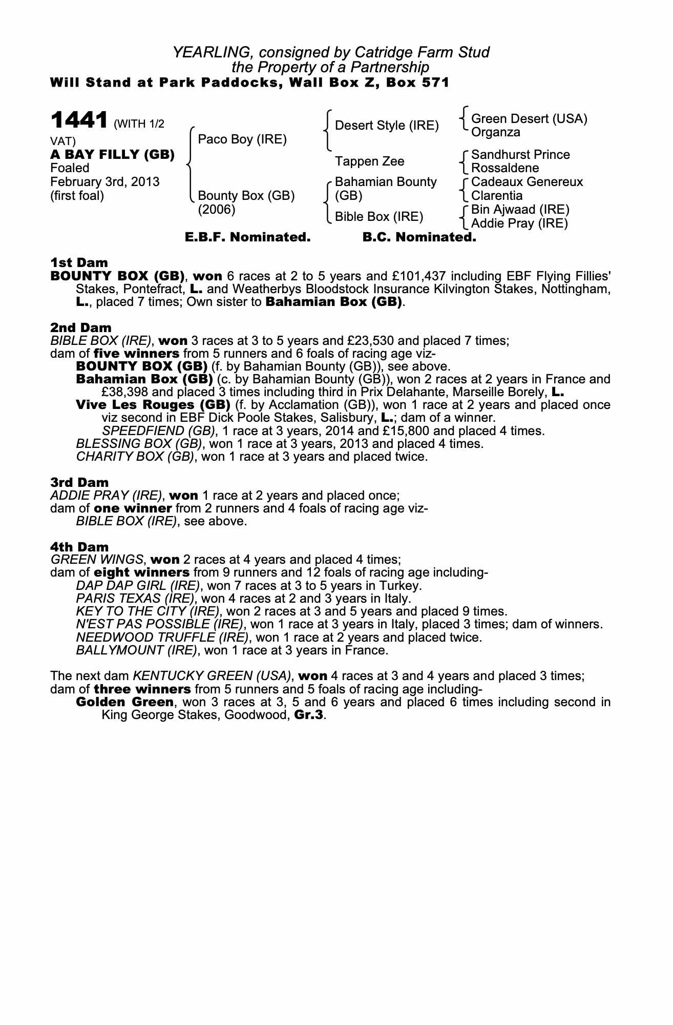 Consignor: Catridge Farm Stud