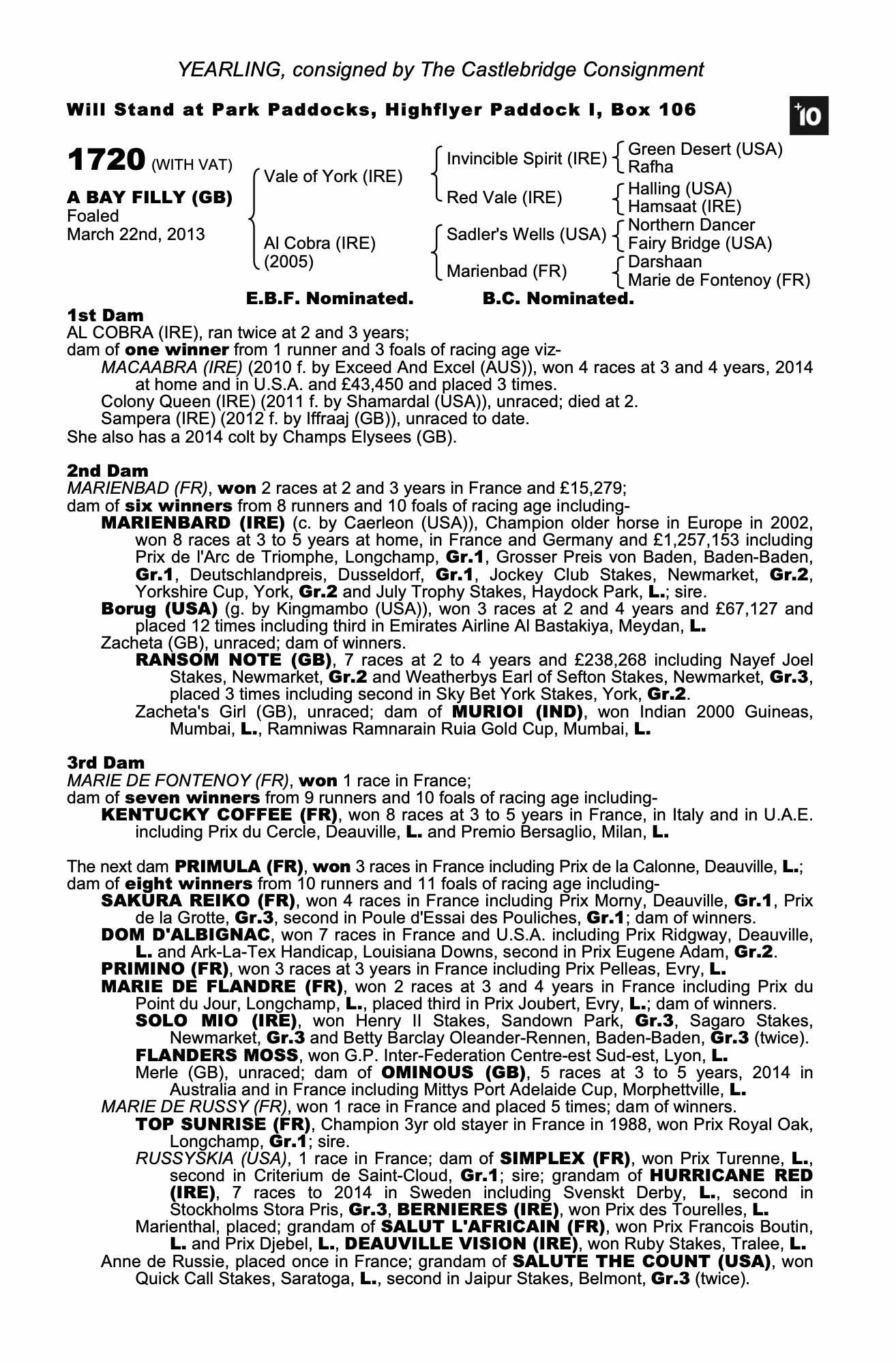 October Yearling Sale, Book 3 2017 lot 1853 F. by Champs Elysees (GB) 2016, Barton Stud=>Vendor 30,000 gns