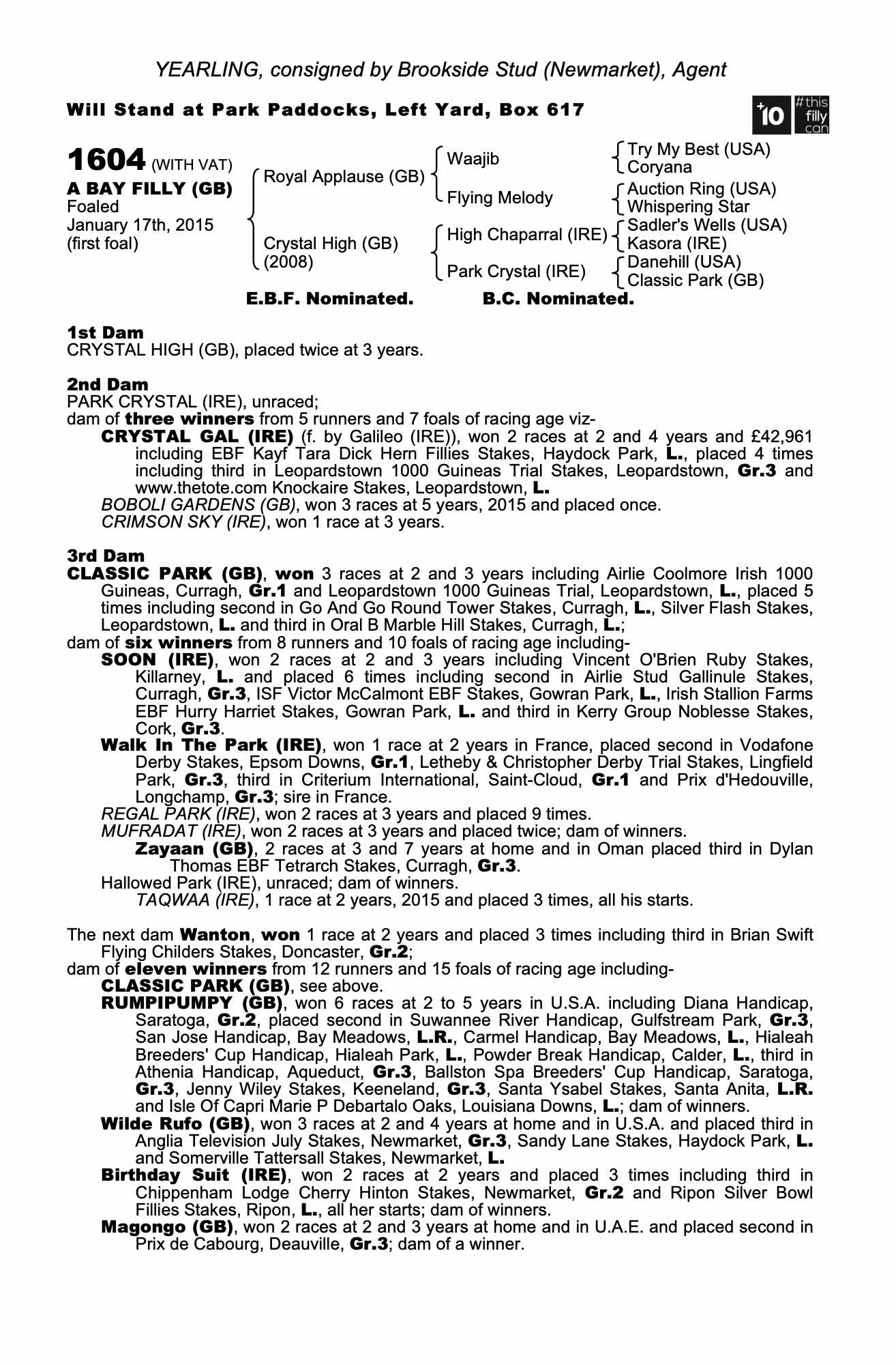 Consignor: Brookside Stud (Newmarket), Agent