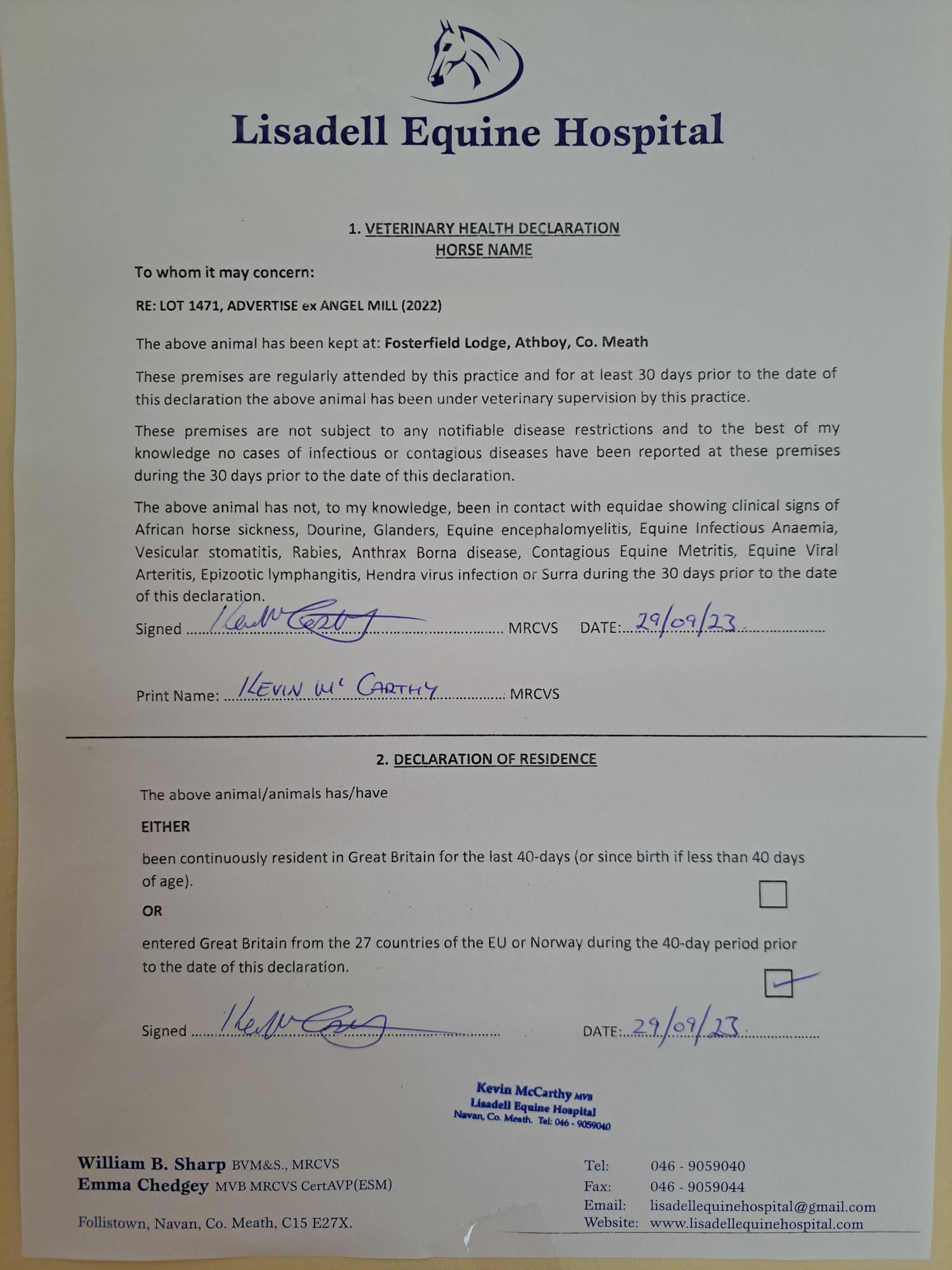 Consignor: Fosterfield Lodge, Ireland