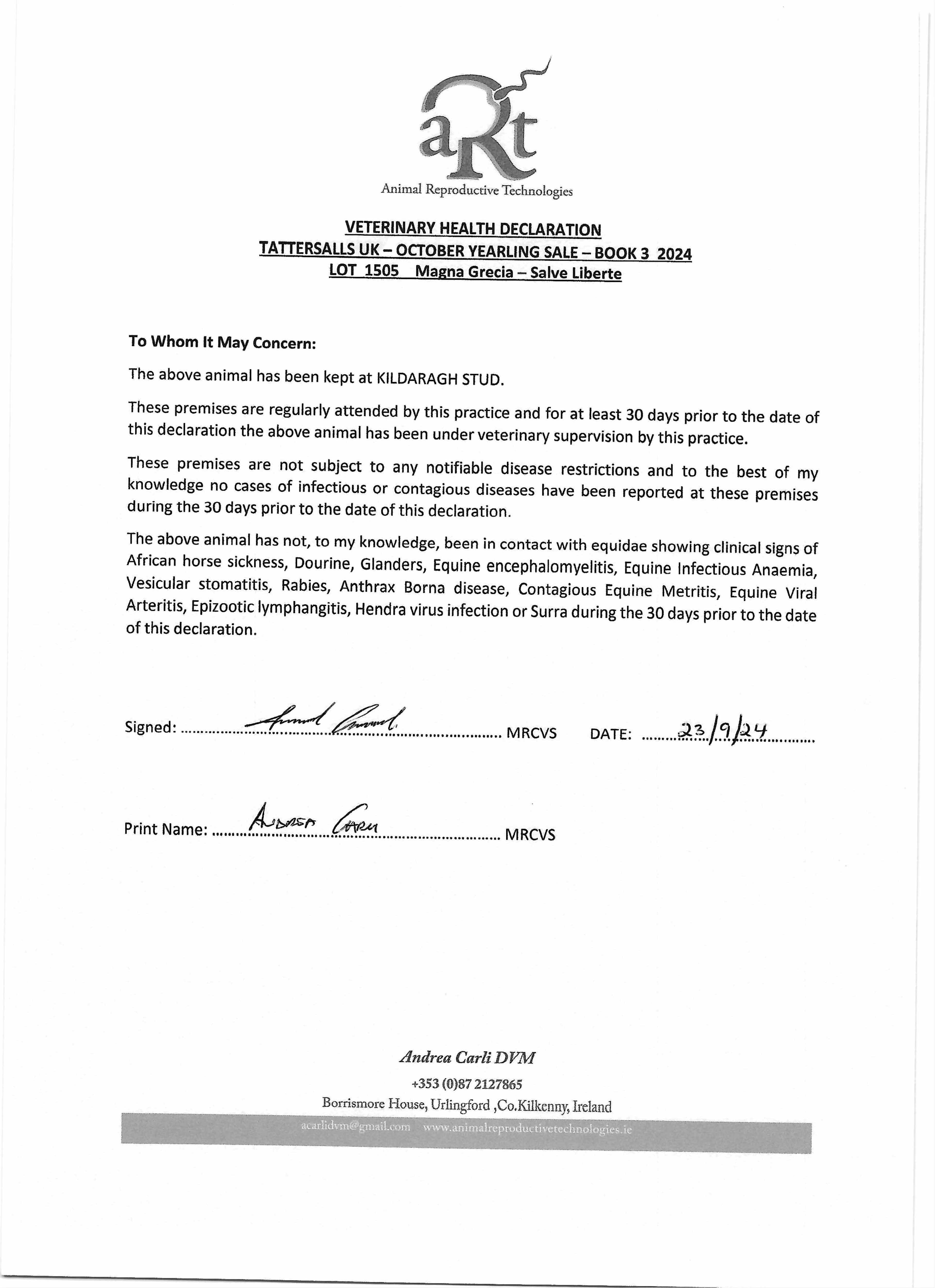 Lot 1505 Magna Grecia (IRE) /Salve Liberte (IRE) B.F. (IRE)